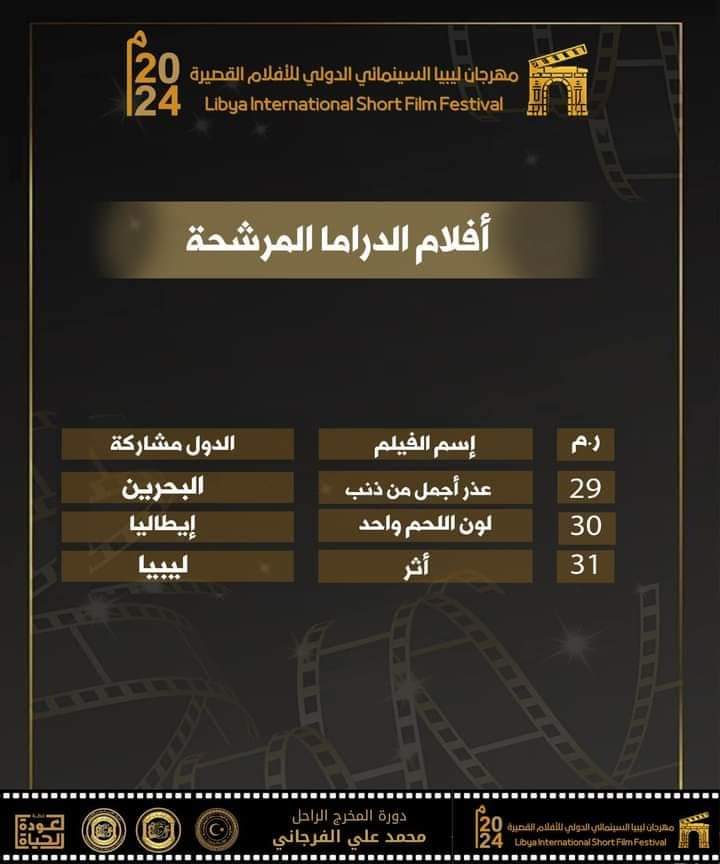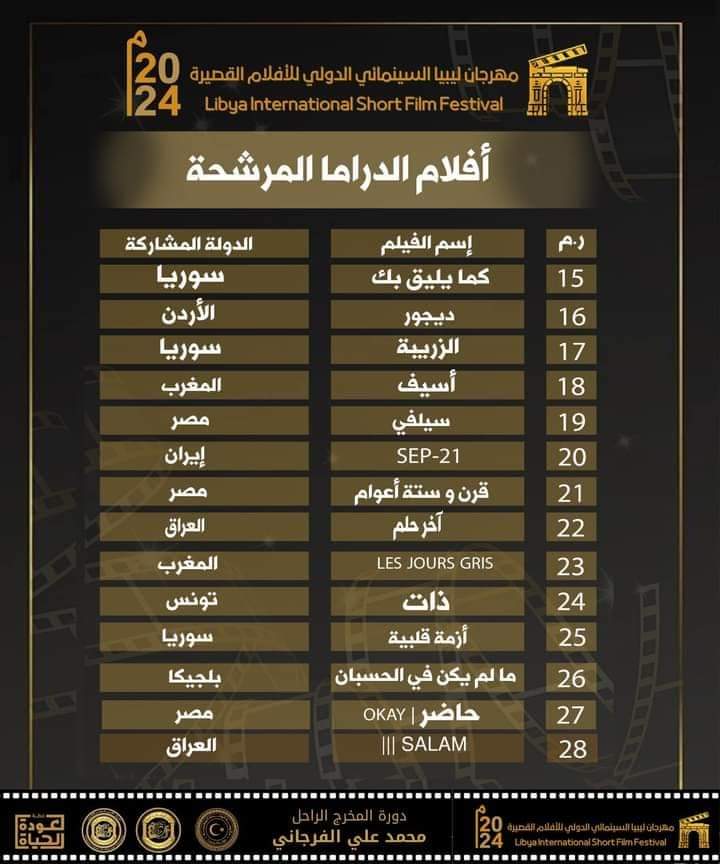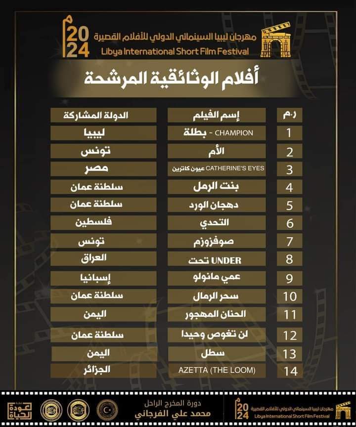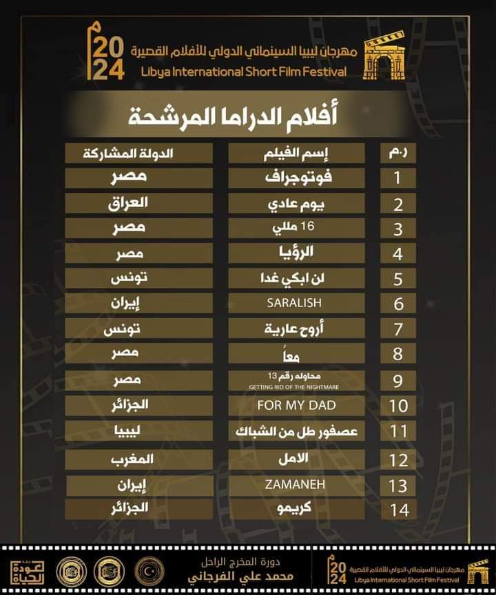 أما القائمة الكاملة للأفلام المرشحة لجوائز الدورة الاولي من مهرجان ليبيا للأفلام القصيرة فهي كالتالي: