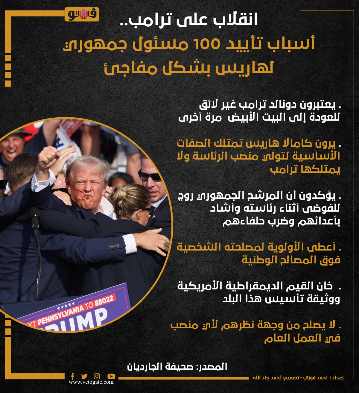 انقلاب على ترامب.. أسباب تأييد 100 مسئول جمهوري لهاريس بشكل مفاجئ (إنفوجراف) الخميس 19/سبتمبر/2024 - 09:30 م 9/19/2024 9:30:56 PM ترامب وهاريس، فيتو احمد فوزي شارك طباعة 18 حجم الخط شارك طباعة هاريس كامالا هاريس ترامب دونالد ترامب منصب الرئاسة القيم الديمقراطية الأمريكية