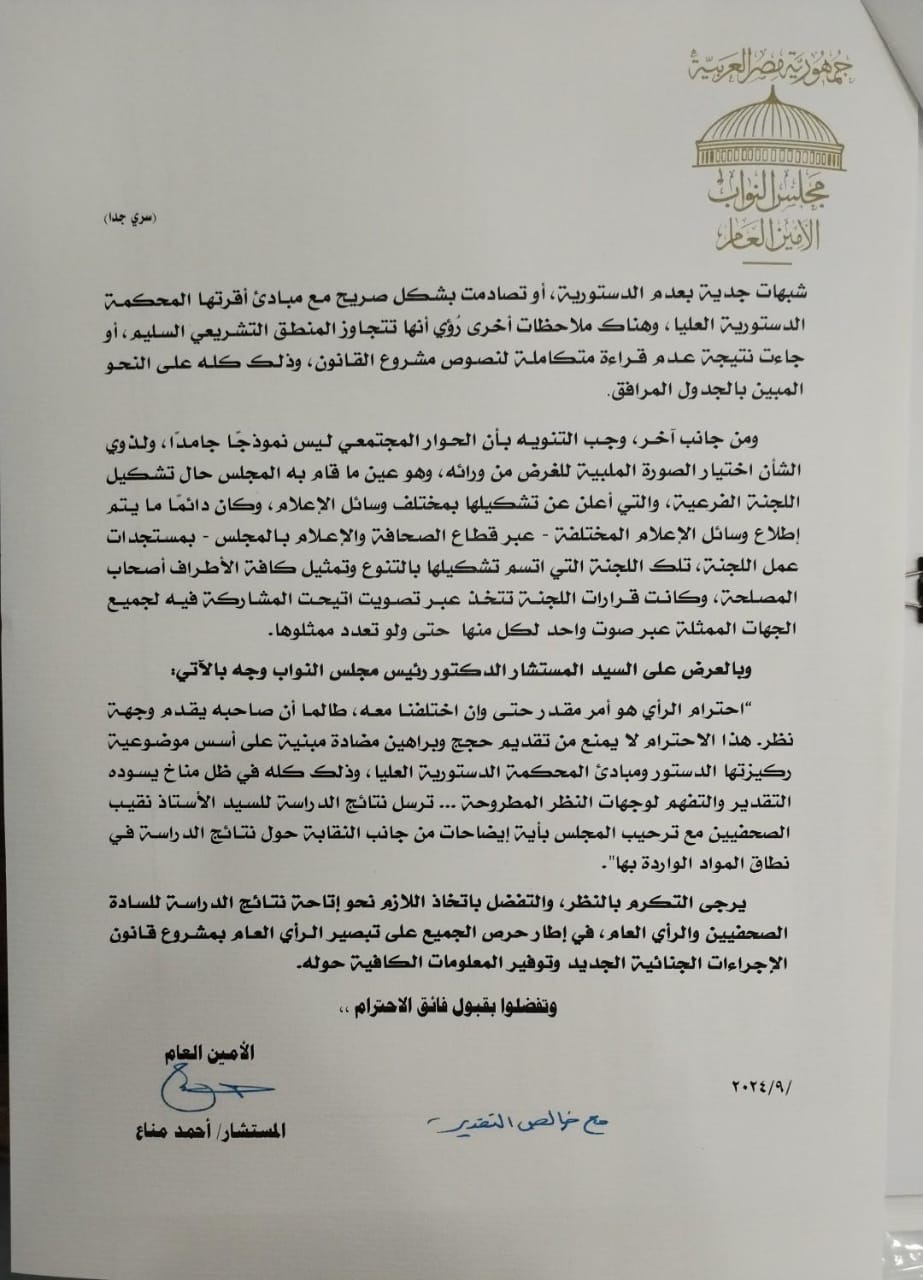 تلقت نقابة الصحفيين ردًا من مجلس النواب حول ملاحظات النقابة على مشروع قانون الإجراءات الجنائية مع نهاية يوم عمل اليوم الخميس.