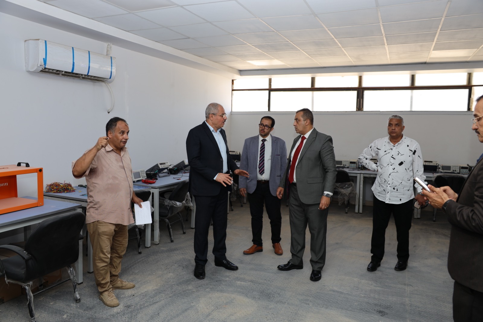 ثم توجه رئيس الجامعة بعد ذلك إلى الدور الثاني لمبنى الورش الذي يحتوي على معمل ورشة الإلكترونيات ومعمل التحكم وفصول دراسية.