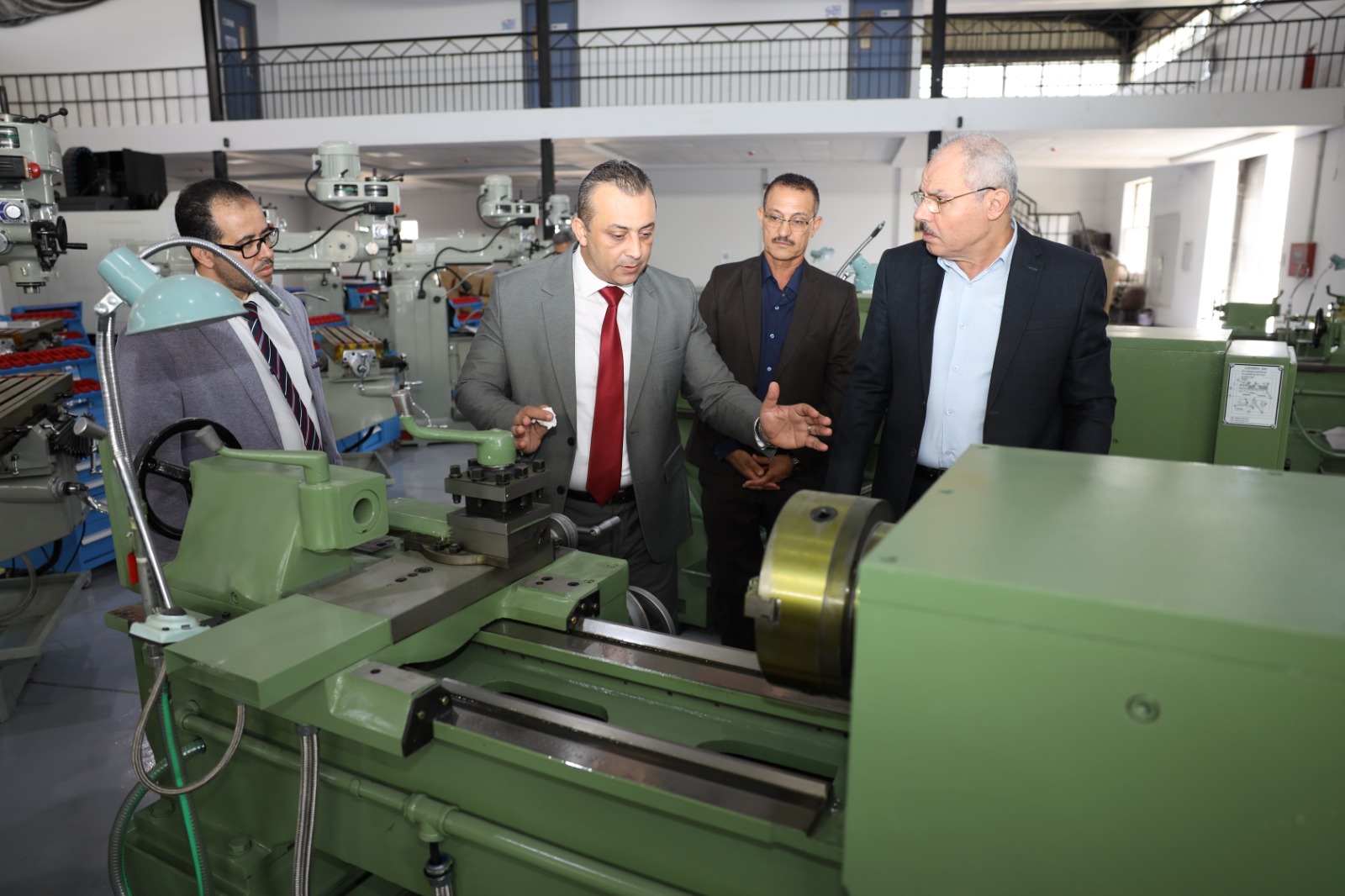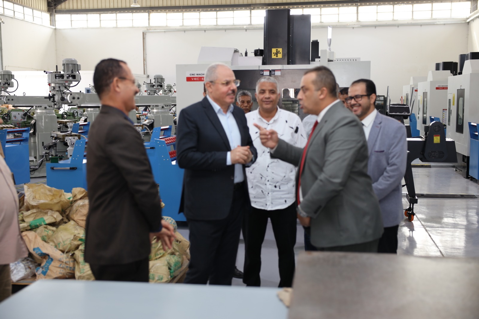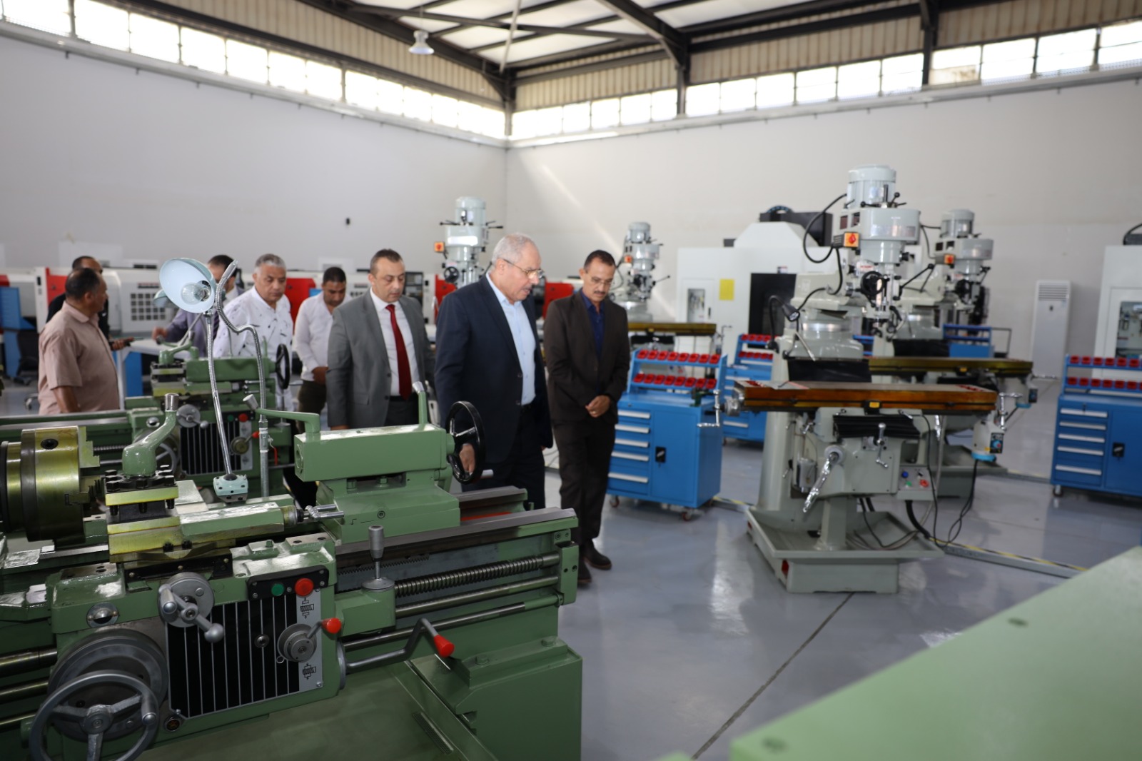 بدأ رئيس الجامعة جولته بمبنى الهنجر والورش، الذي تم تجهيزه بـ 40 ماكينة تشغيل، منها 8 ماكينات CNC للخراطة على أحدث التقنيات العالمية، و8 ماكينات CNC للتفريز، و12 ماكينة تقليدية للخراطة، و3 ماكينات تقليدية للتفريز. كما تضمن المبنى جميع المعدات والأجزاء والخامات اللازمة لعمليات التشغيل.