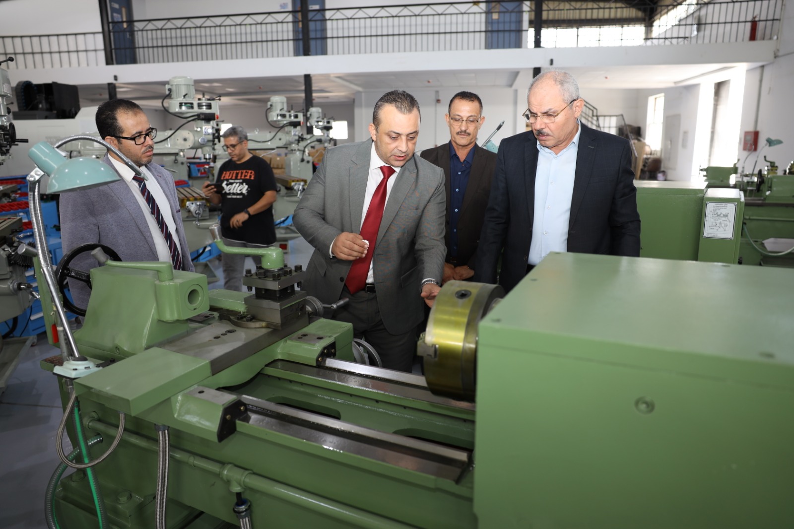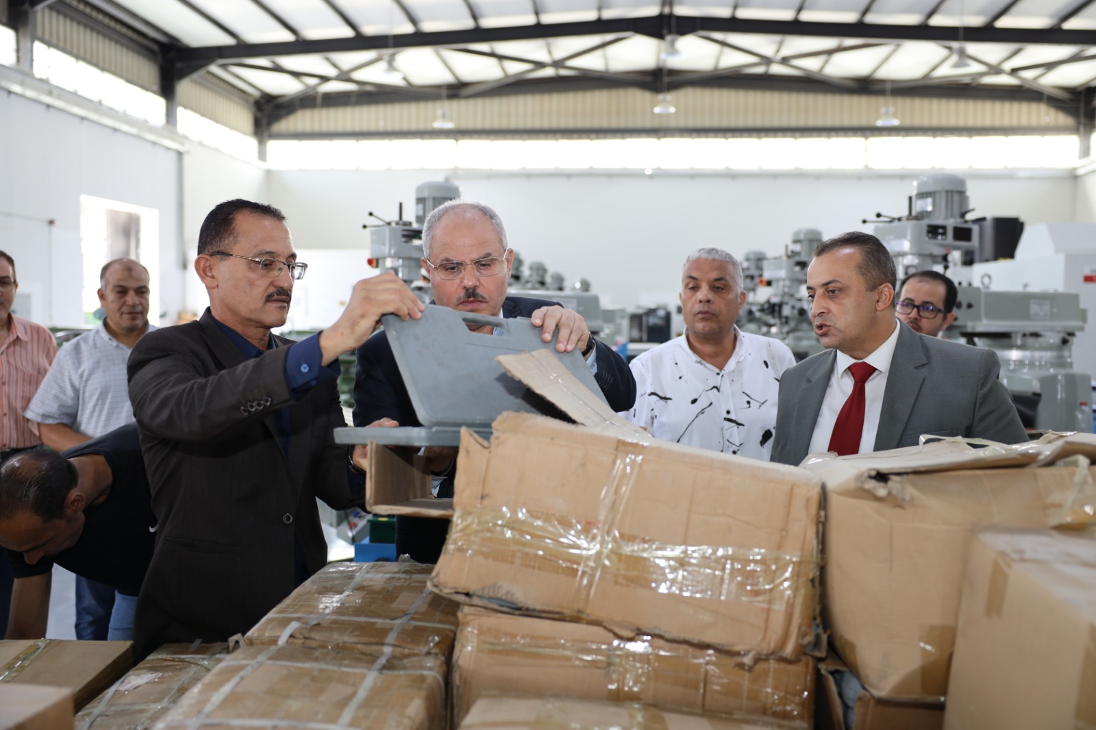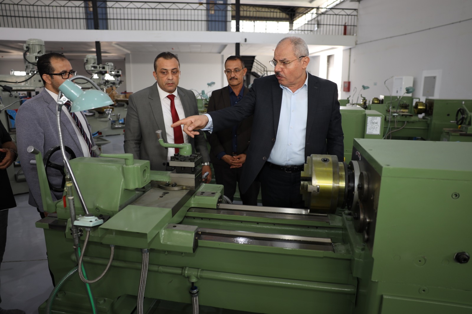 بدأ رئيس الجامعة جولته بمبنى الهنجر والورش، الذي تم تجهيزه بـ 40 ماكينة تشغيل، منها 8 ماكينات CNC للخراطة على أحدث التقنيات العالمية، و8 ماكينات CNC للتفريز، و12 ماكينة تقليدية للخراطة، و3 ماكينات تقليدية للتفريز. كما تضمن المبنى جميع المعدات والأجزاء والخامات اللازمة لعمليات التشغيل.