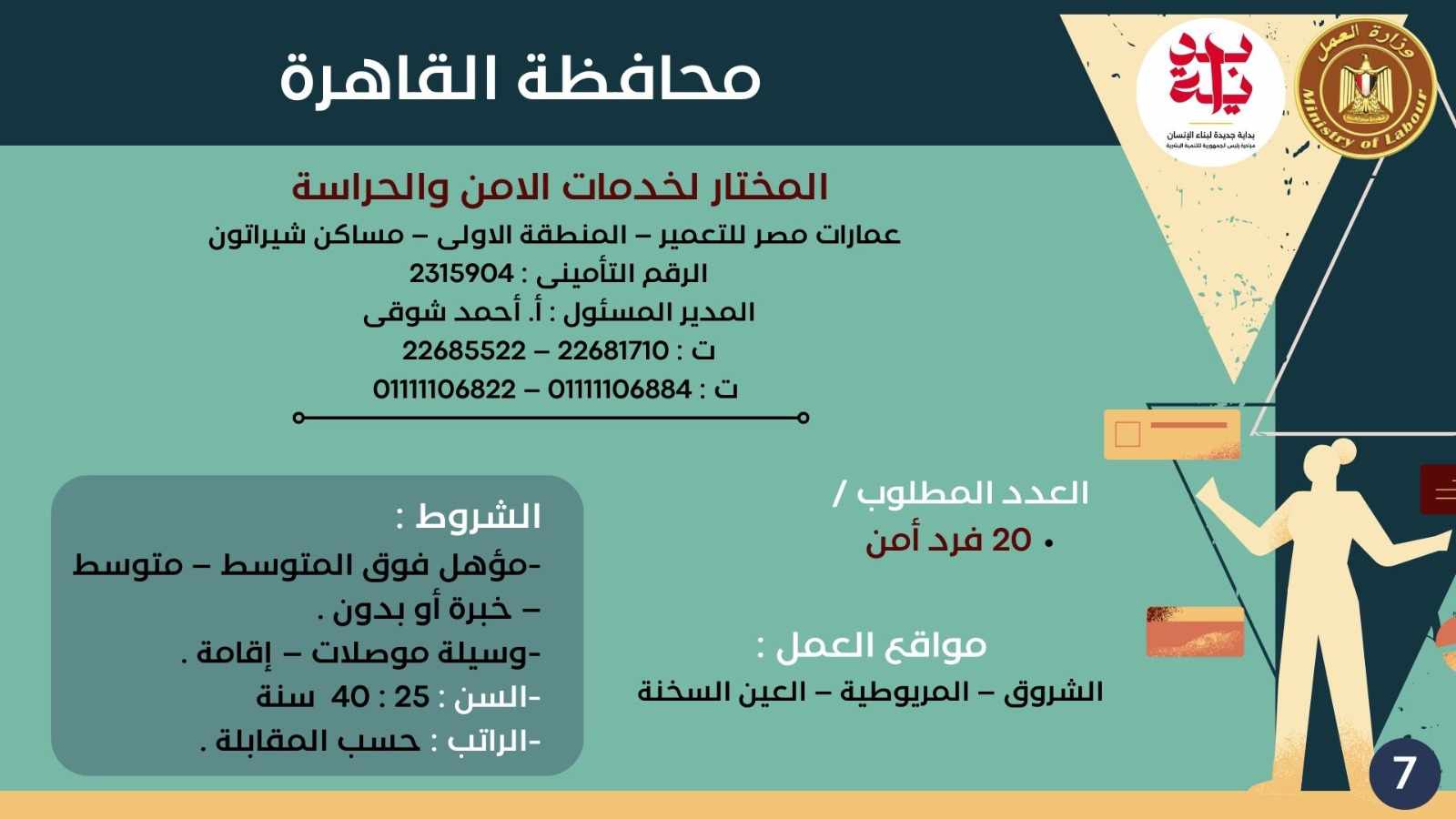وبحسب البيان قالت "الوزارة" إن نشرة التوظيف الدورية تَصّدُر كل 15 يومًا، من خلال الإدارة العامة للتشغيل برئاسة هبه أحمد مدير عام التشغيل بالوزارة، وإعداد منى شوقي باحث أول بـ"الإدارة"، تُعلِن اليوم عن فُرص عمل جديدة، مُتوفرة في 13 محافظة، هي: القاهرة، والجيزة، والقليوبية، والغربية، والبحيرة، والدقهلية، والإسكندرية، والشرقية، والسويس، والفيوم، ودمياط، وبورسعيد، والمنيا.. وفي تخصصات:أخصائي تسويق، ومسؤول إئتمان، ومحاسبين،و مسؤول شؤون إدارية، وأخصائى hs5، ومدير مالى، ومدير تسويق عقارى، ومدرسي علوم ورياضيات، ورسام هندسى ميكانيكى، ومشرف حركة، وأخصائى نظم معلومات، ومشرف موقع، ومشرف عام، وصيدلي.