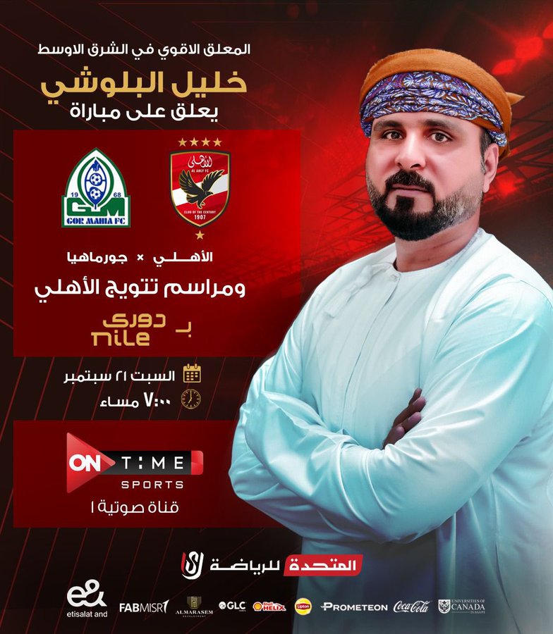 أعلنت شبكة قنوات أون تايم سبورتس، تعيين المعلق العماني خليل البلوشي معلقا على مباراة الأهلي وجورماهيا الكيني في إياب دور الـ32 من بطولة دوري أبطال إفريقيا.
