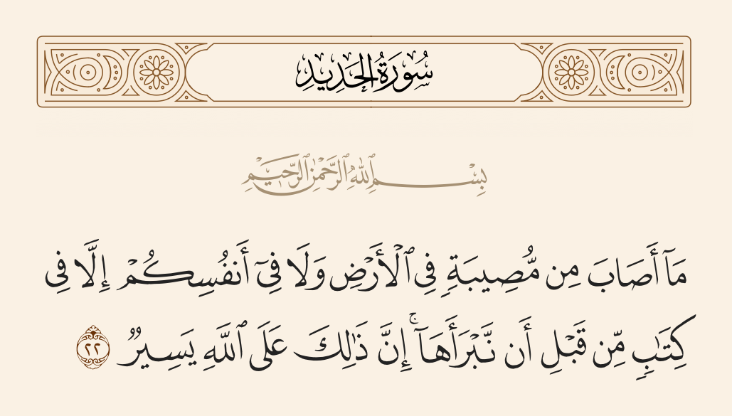 قال تعالى: «مَا أَصَابَ مِن مُّصِيبَةٍ فِي الْأَرْضِ وَلَا فِي أَنفُسِكُمْ إِلَّا فِي كِتَابٍ مِّن قَبْلِ أَن نَّبْرَأَهَا ۚ إِنَّ ذَٰلِكَ عَلَى اللَّهِ يَسِيرٌ».
