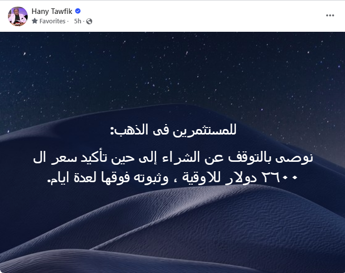 وقال هاني توفيق في نصيحته التي وجهها للـمستثمرين في الذهب: "للمستثمرين فى الذهب: نوصى بالتوقف عن الشراء إلى حين تأكيد سعر الـ ٢٦٠٠ دولار للأوقية، وثبوته فوقها لعدة أيام".