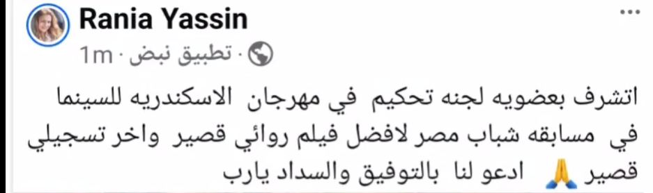 وأعربت رانيا محمود ياسين، عن سعادتها الكبيرة بهذه الخطوة، عبر صفحتها الرسمية على فيس بوك، وكتبت قائلة: "أتشرف بعضوية لجنة تحكيم في مهرجان الإسكندرية للسينما في مسابقة شباب مصر لأفضل فيلم روائي قصير وآخر تسجيلي قصير.. ادعو لنا بالتوفيق والسداد يارب".