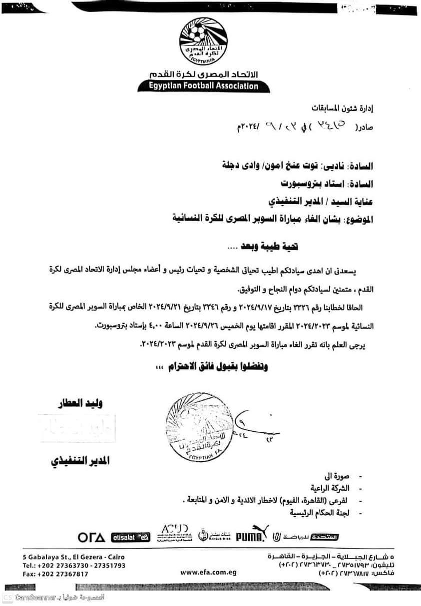 إلغاء مباراة سوبر الكرة النسائية بين وادي دجلة وتوت عنخ أمون (مستند)