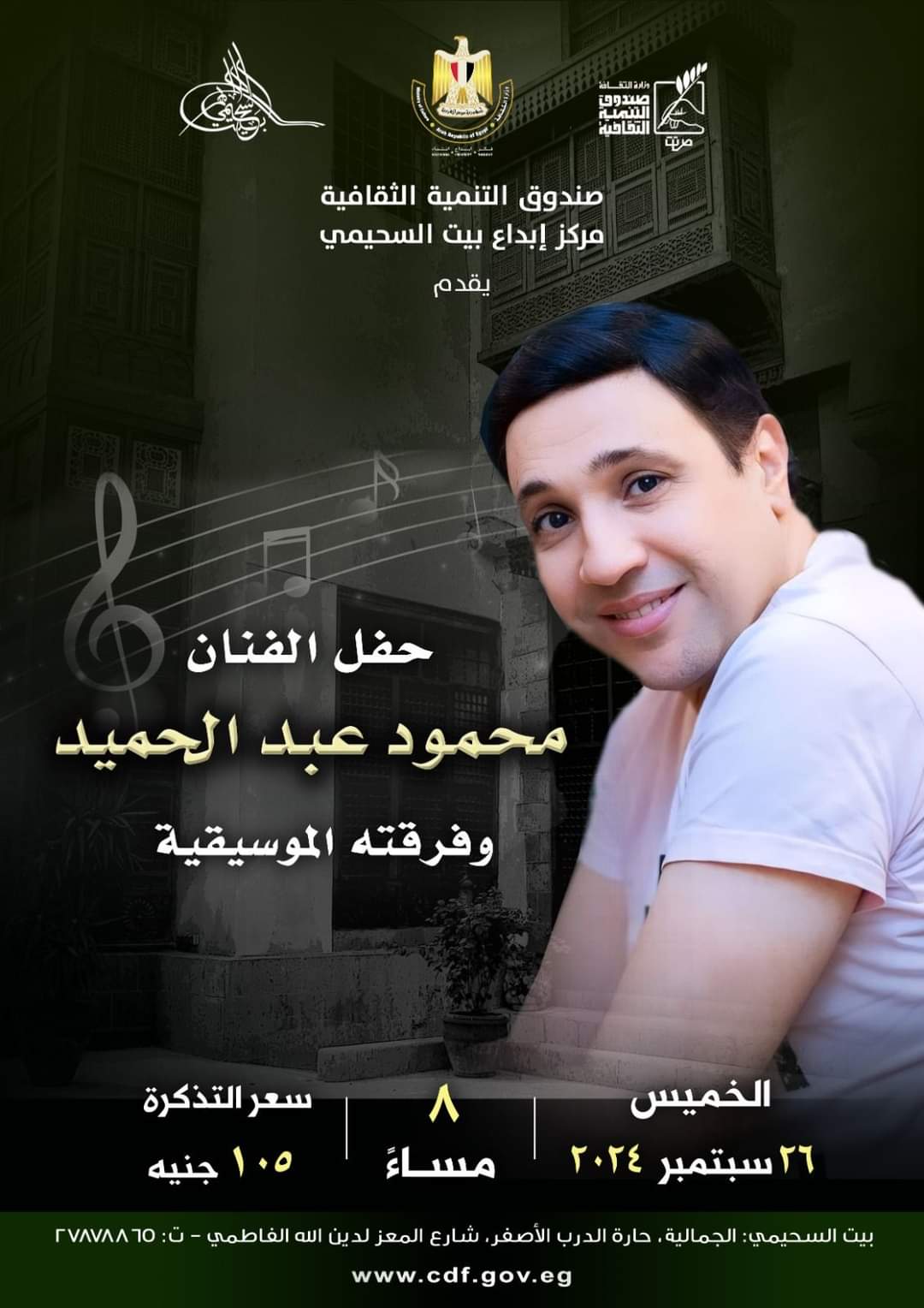يقيم مركز إبداع بيت السحيمي بشارع المعز، التابع لقطاع صندوق التنمية الثقافية برئاسة المعماري حمدي السطوحي أمسية طربية جديدة للفنان محمود عبد الحميد وفرقته الموسيقية، وذلك في الثامنة مساء الخميس 26 سبتمبر.