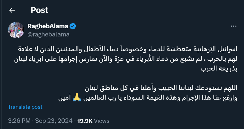 وعبر راغب عن غضبه الشديد لما تمارسه قوات الاحتلال الإسرائيلي من جرائم ضد الأطفال والمدنيين فى لبنان، فكتب: “ إسرائيل الإرهابية متعطشة للدماء وخصوصًا دماء الأطفال والمدنيين الذين لا علاقة لهم بالحرب، لم تشبع من دماء الأبرياء في غزة والآن تمارس إجرامها على أبرياء لبنان بذريعة الحرب”