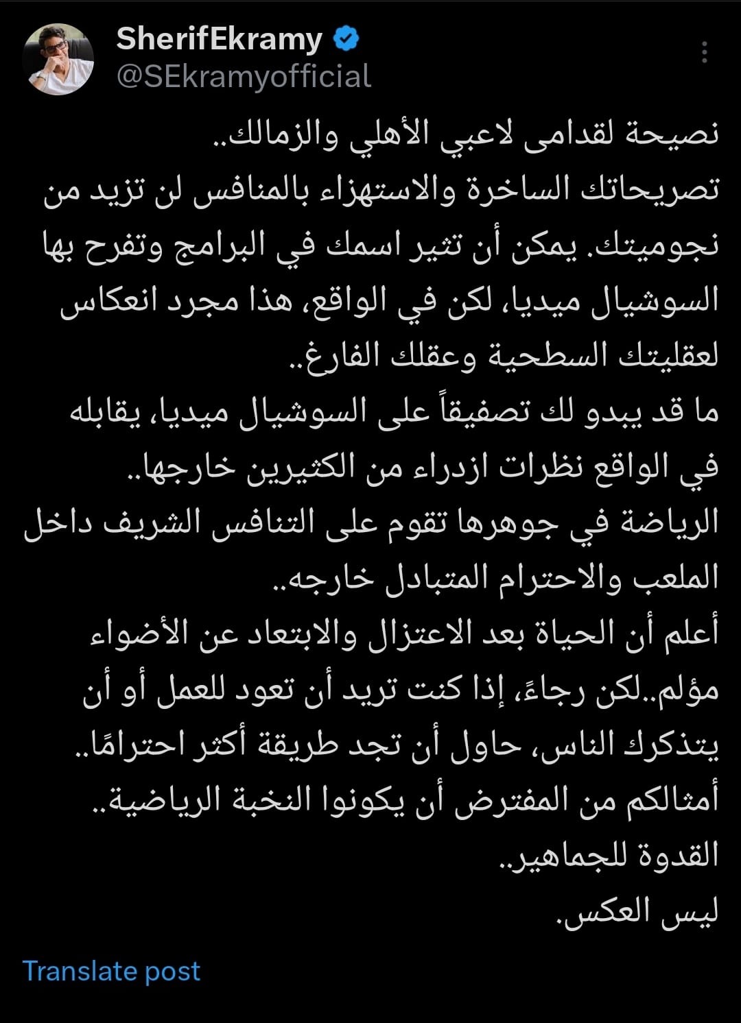 شريف إكرامي يهاجم أحمد بلال وقدامي الأهلي والزمالك