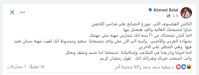 وتابع:"بشهادة العربي والأجنبي ولسه إلى الآن مش واخد بنصيحتنا سعيد ومبسوط انك لقيت مهنة ممكن تجيد فيها وهي التنظير علي الآخرين..احنا خبرتنا وتاريخنا في الملاعب وإمكانياتنا تسمحلنا اننا نشيد وننتقد ونحلل..وانت اصبحت خبرتك وقدراتك انك تقول رمضان كريم"