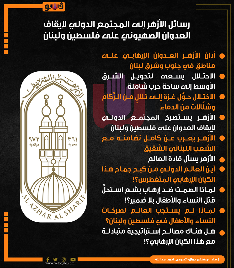 رسائل الأزهر إلى المجتمع الدولي لإيقاف العدوان الصهيوني على فلسطين ولبنان (إنفو جراف) الأربعاء 25/سبتمبر/2024 - 10:54 ص 9/25/2024 10:54:23 AM جامع الأزهر، فيتو مصطفى جمال شارك طباعة 18 حجم الخط شارك طباعة الازهر لبنان فلسطين الشعب اللبناني