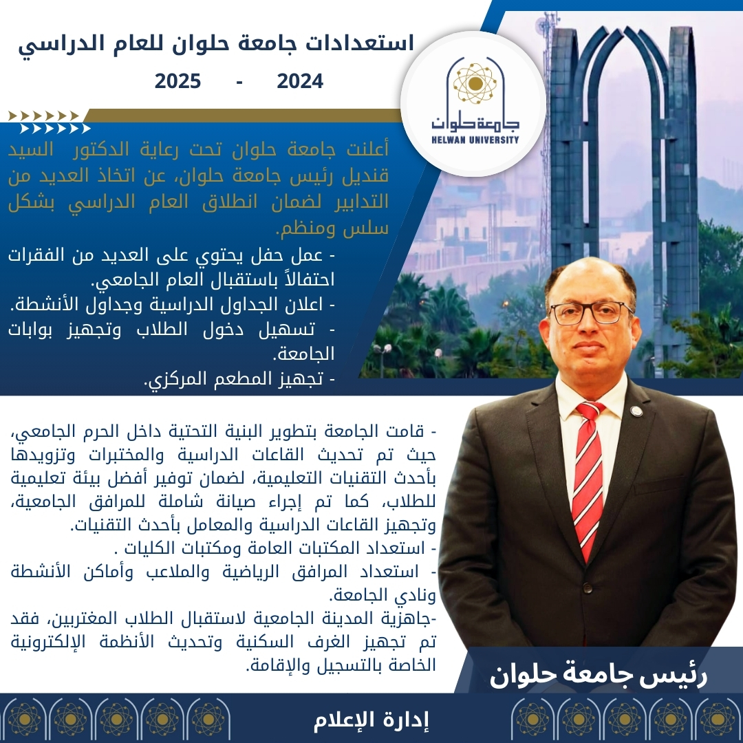 - تهدف هذه الاستعدادات المكثفة إلى ضمان انطلاقة قوية للعام الدراسي الجديد في جامعة حلوان، مع توفير بيئة أكاديمية متكاملة تلبي احتياجات الطلاب وتدعم مسيرتهم التعليمية.