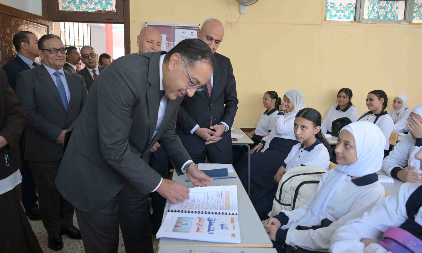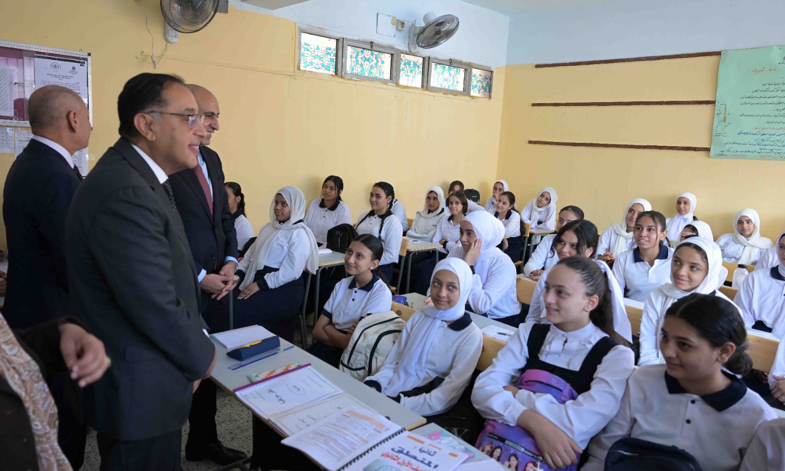 مدبولي يجري حوارا مع عدد من الطالبات حول المناهج في مدرسة بالسلام (صور)