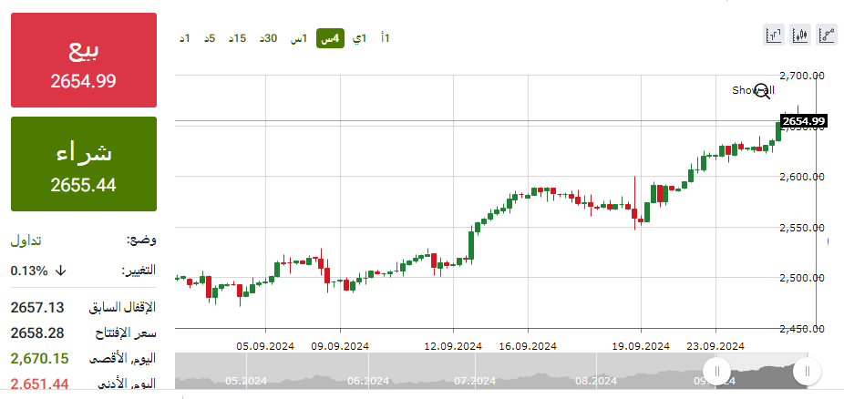 سجل سعر أونصة الذهب العالمي ارتفاع خلال التداولات ليسجل أعلى مستوى تاريخي عند 2655 دولارا للأونصة ليتخطى السعر المستوى 2600 دولار للأونصة.