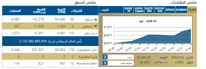 - ارتفع مؤشر "إيجي إكس 30" بنسبة 0.28% عند مستوى 30.958.90 نقطة.