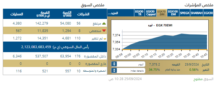 - ارتفع مؤشر "إيجي إكس 70 بنسبة 0.60% عند مستوى 7.377.91 نقطة.