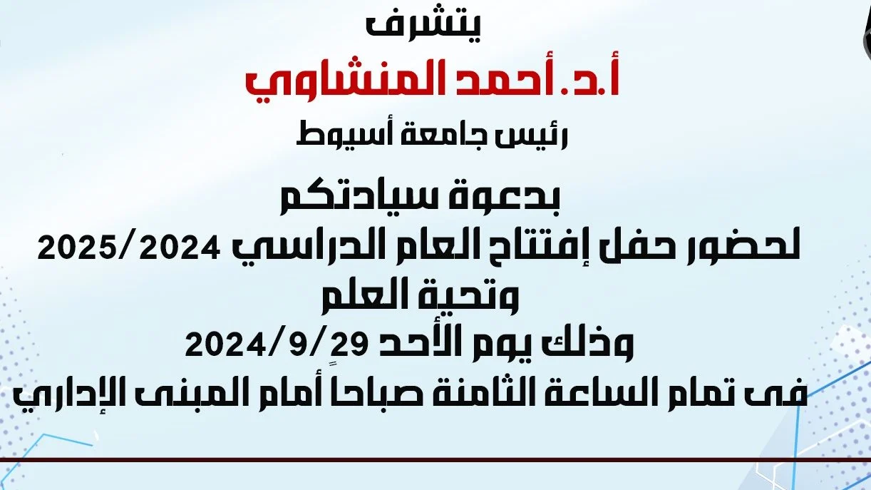 تنظم جامعة أسيوط، حفل افتتاح العام الدراسي 2024/ 2025، وتحية العلم، تحت رعاية الدكتور المنشاوى رئيس الجامعة؛ وإشراف: الدكتور أحمد عبد المولى نائب رئيس الجامعة لشئون التعليم والطلاب، وذلك يوم الأحد المقبل 29 سبتمبر، في تمام الساعة الثامنة صباحًا، أمام المبنى الإداري، والذى يعد تقليدًا سنويًا تنظمه الجامعة، بالتعاون مع أسرة طلاب من أجل مصر، واتحاد طلاب الجامعة، وإدارة الجوالة بالإدارة العامة لرعاية الشباب، وذلك؛ لتعزيز روح الولاء، والانتماء، والمواطنة بين طلاب وطالبات جامعة أسيوط.