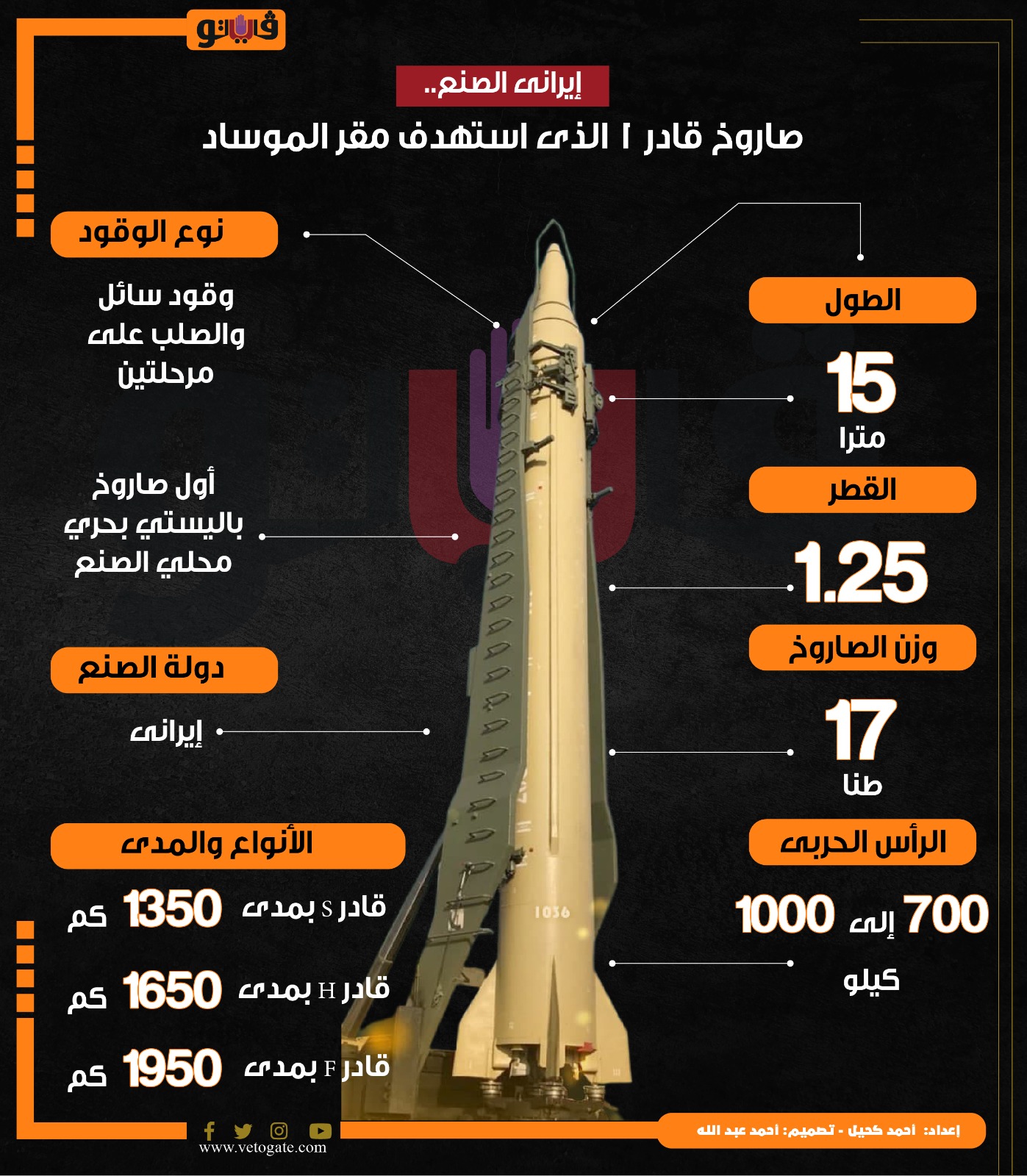 إيرانى الصنع.. صاروخ قادر 1 الذى استهدف مقر الموساد (إنفوجراف) الأربعاء 25/سبتمبر/2024 - 05:10 م 9/25/2024 5:10:11 PM صاروخ قادر 1، فيتو أحمد كحيل شارك طباعة 18 حجم الخط شارك طباعة إيران قادر1 صاروخ قادر 1 حزب الله الموساد إسرائيل صاروخ باليستي