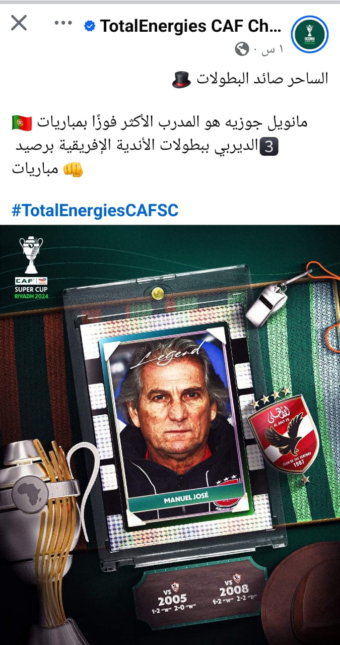 ونشر الحساب الرسمي لدوري أبطال إفريقيا والكونفدرالية الإفريقية، على موقع التواصل الاجتماعي للتدوينات القصيرة «إكس»، صورة مانويل جوزيه وعلق عليها قائلًا: «الساحر صائد البطولات.. مانويل جوزيه هو المدرب الأكثر فوزًا بمباريات الديربي ببطولات الأندية الإفريقية برصيد 3 مباريات».