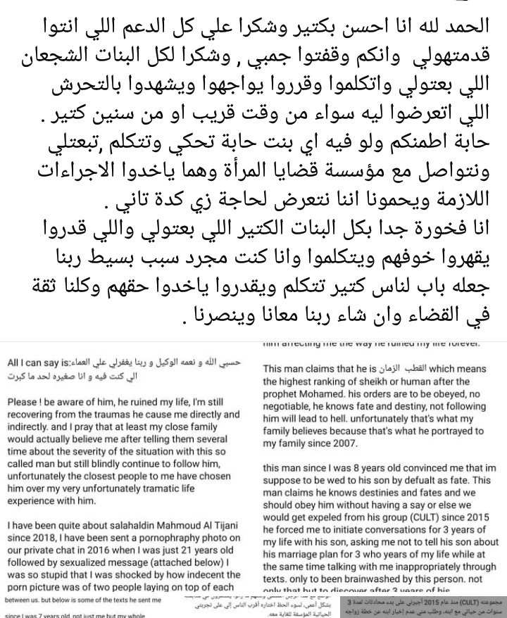 نشرت صاحبة واقعة التحرش التي اتهمت فيها الشيخ صلاح الدين التيجاني، بيان شكر على حسابها الشخصي بموقع التواصل الاجتماعي "فيس بوك" لكل من دعمها في أزمتها خلال هذه الفترة العصيبة.
