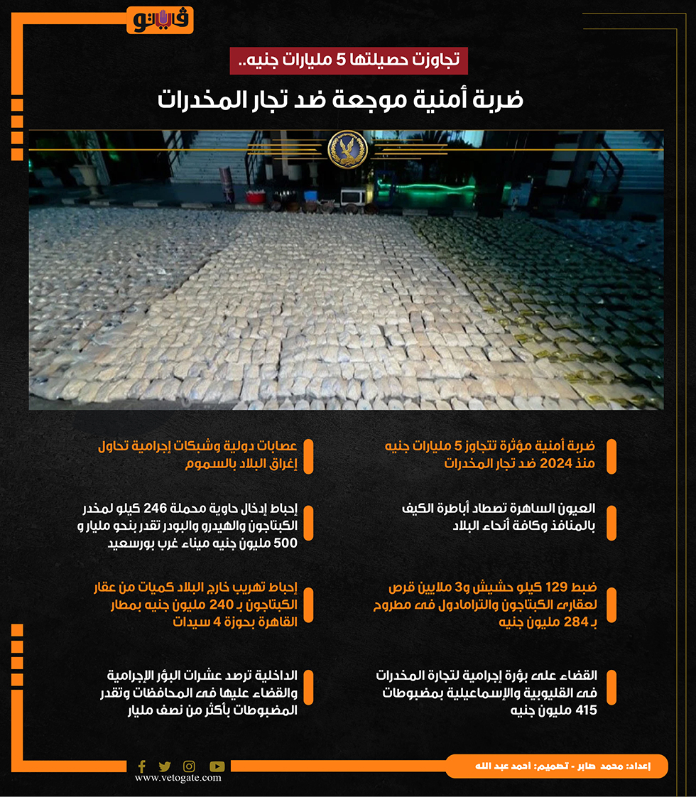 تجاوزت حصيلتها 5 مليارات جنيه.. ضربة أمنية موجعة ضد تجار المخدرات (إنفوجراف) الأربعاء 25/سبتمبر/2024 - 10:00 م 9/25/2024 10:00:38 PM انفوا.. ضربة أمنية مؤثرة تتجاوز 5 مليارات جنيه منذ 2024 ضد محمد صابر شارك طباعة 18 حجم الخط شارك طباعة ميناء غرب بورسعيد غرب بورسعيد عقار الكبتاجون شبكات إجرامية القضاء على بؤرة إجرامية