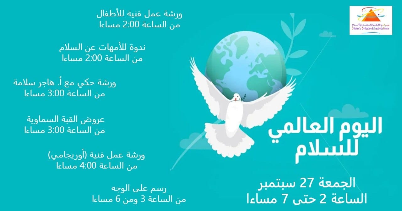 ويصادف هذا العام الذكرى الـ25 لاعتماد الجمعية العامة للأمم المتحدة إعلان وبرنامج عمل بشأن ثقافة السلام؛ حيث تقدم ندوة للأمهات بعنوان "التربية الايجابية والتنشئة الصحيحة رؤي لبداية جديدة"، ويشمل الاحتفال ورش عمل فنية للأطفال، ورشة حكي تقدمها الكاتبة هاجر سلامة ورشة فنية “أوريجامي” إلى جانب عروض القبة السماوية.