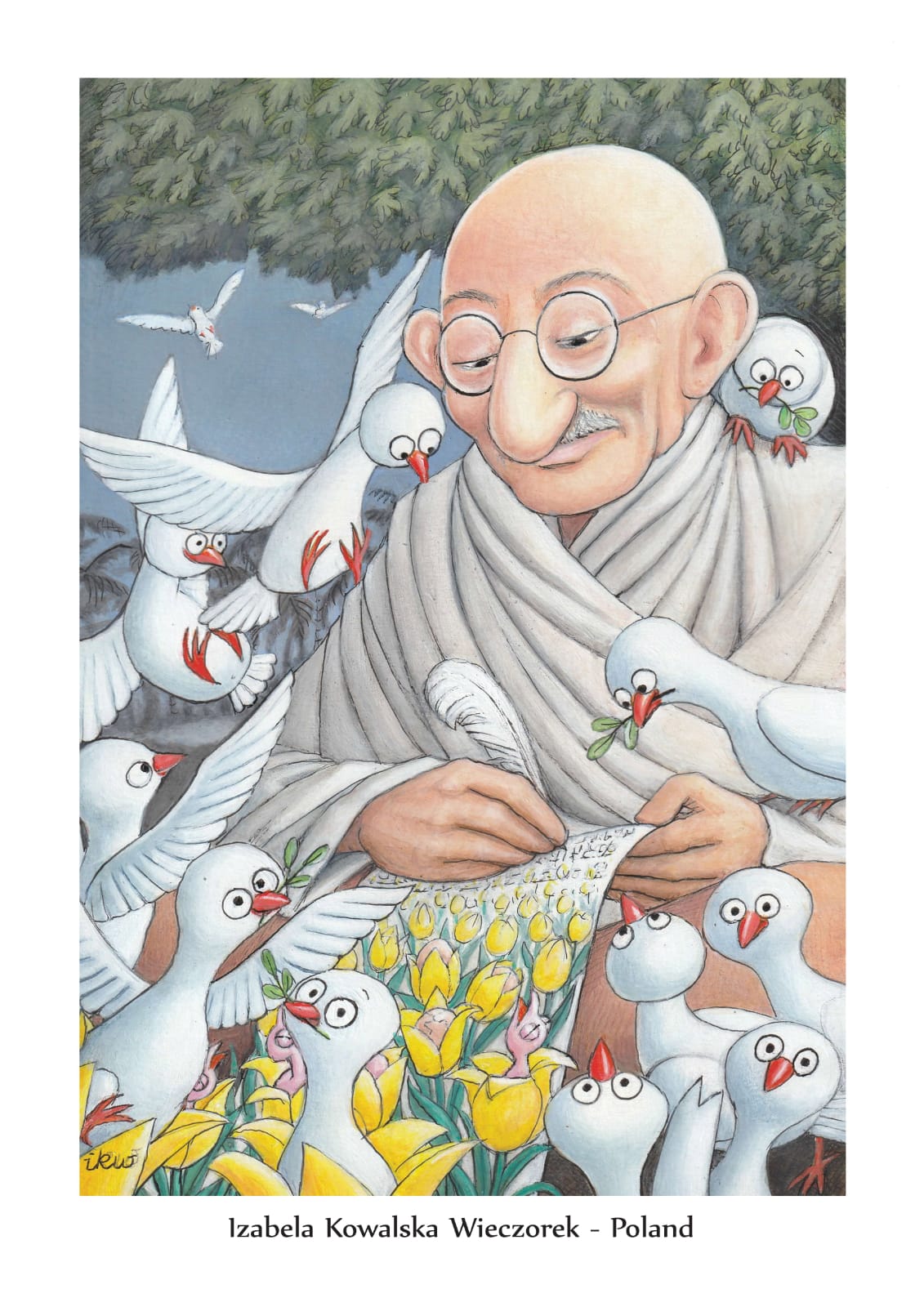 ويضم المعرض مايقرب من 40 بورتريه كاريكاتيري لغاندي، رسمها فنانون من 12 دولة من بينها؛ الهند، المملكة العربية السعودية، العراق، رومانيا، إندونيسيا، كولومبيا، قبرص، بولندا، كوبا، إسبانيا، البوسنة والهرسك، ومصر.