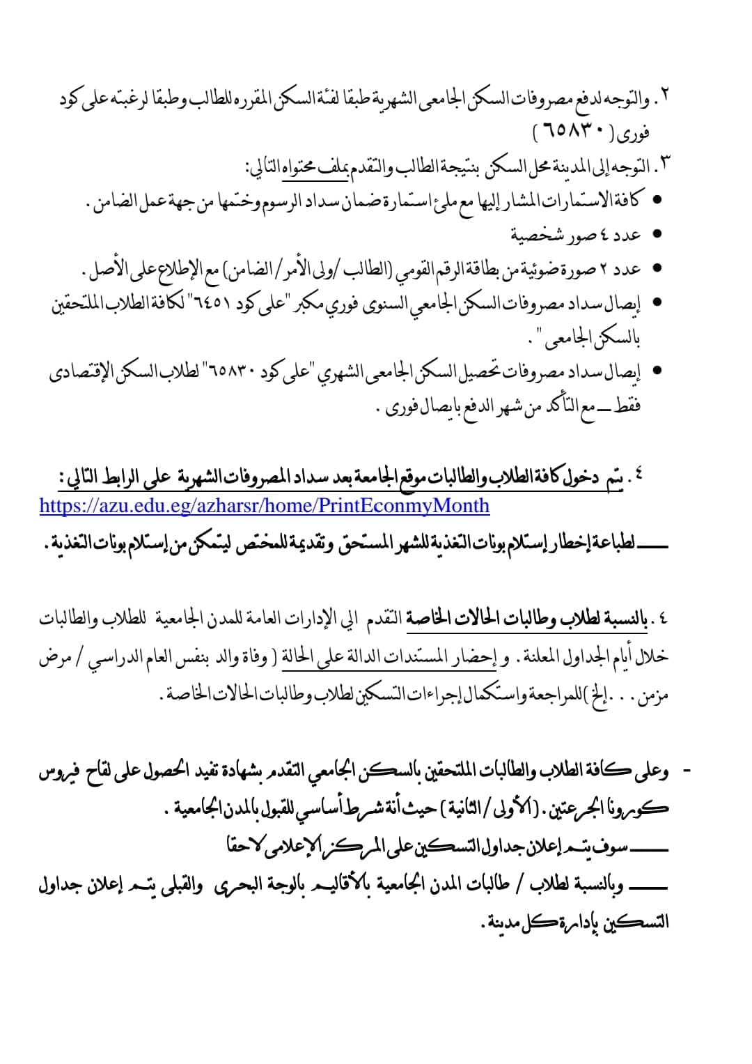. عدد ٢ صورة ضوئية من بطاقة الرقم القومي الطالب / ولى الأمر / الضامن) مع الإطلاع على الأصل.. إيصال سداد مصروفات السكن الجامعي السنوى فوري مكبر على كود ١٦٤٥١ لكافة الطلاب الملتحقين بالسكن الجامعي ".. إيصال سداد مصروفات تحصيل السكن الجامعي الشهري "على كود ٦٥٨٣٠" لطلاب السكن الإقتصادي فقط - مع التأكد من شهر الدفع بايصال فورى.