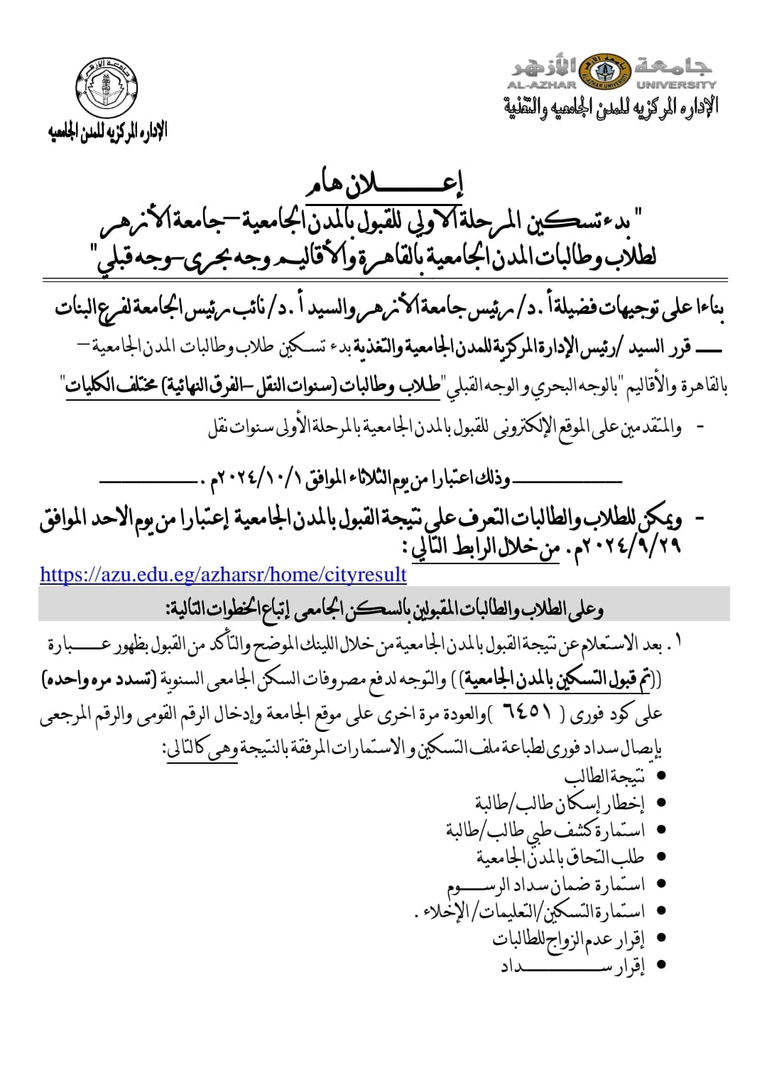 أعلنت جامعة الأزهر بدء تسكين طلاب وطالبات المدن الجامعية بالقاهرة والأقاليم بالوجه البحري والوجه القبلي طلاب وطالبات سنوات النقل الفرق النهائية) مختلف الكليات" والمتقدمين على الموقع الإلكتروني للقبول بالمدن الجامعية بالمرحلة الأولى سنوات نقل وذلك اعتبارا من يوم الثلاثاء الموافق ٢٠٢٤/١٠/١ م.