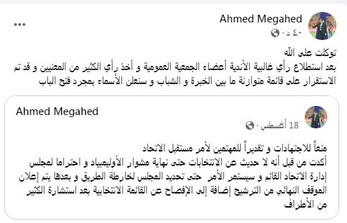 وكتب أحمد مجاهد عبر حسابه على موقع التواصل الاجتماعي "فيس بوك": "توكلت على الله بعد استطلاع رأي غالبية الأندية أعضاء الجمعية العمومية وأخذ رأي الكثير من المعنيين".