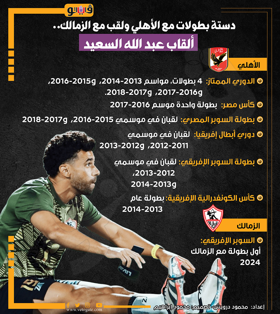 دستة بطولات مع الأهلي ولقب مع الزمالك.. ألقاب عبد الله السعيد (إنفوجراف) السبت 28/سبتمبر/2024 - 03:40 م 9/28/2024 3:40:57 PM عبد الله السعيد محمود درويش شارك طباعة 18 حجم الخط شارك طباعة عبدالله السعيد الزمالك الأهلي بطولات عبدالله السعيد الدوري الممتاز السوبر الأفريقي
