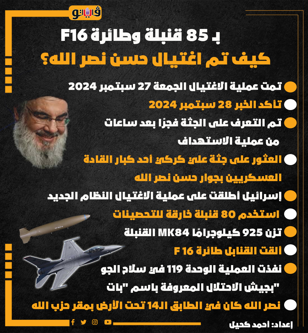 بـ 85 قنبلة وطائرة F16.. كيف تم اغتيال حسن نصر الله؟ (إنفوجراف) الأحد 29/سبتمبر/2024 - 01:56 ص 9/29/2024 1:56:05 AM حسن نصر الله، فيتو أحمد كحيل شارك طباعة 18 حجم الخط شارك طباعة القنبلة MK84 نصر الله النظام الجديد عملية الإغتيال إسرائيل طائرة F16 جيش الاحتلال بات الوحدة 119 في سلاح الجو بجيش الاحتلال الوحدة 119 حزب الله