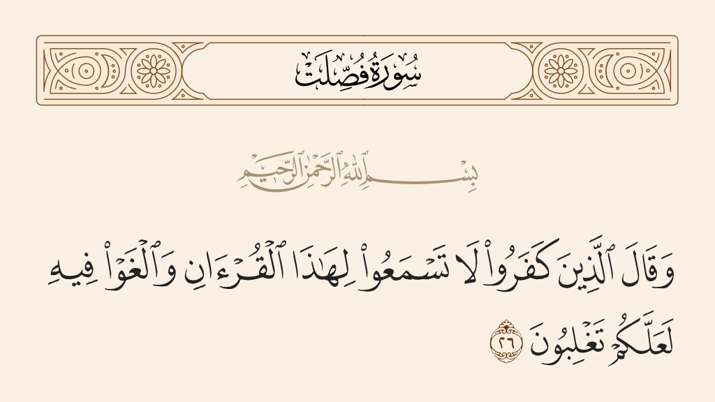 قال تعالى: «وَقَالَ الَّذِينَ كَفَرُوا لَا تَسْمَعُوا لِهَٰذَا الْقُرْآنِ وَالْغَوْا فِيهِ لَعَلَّكُمْ تَغْلِبُونَ».