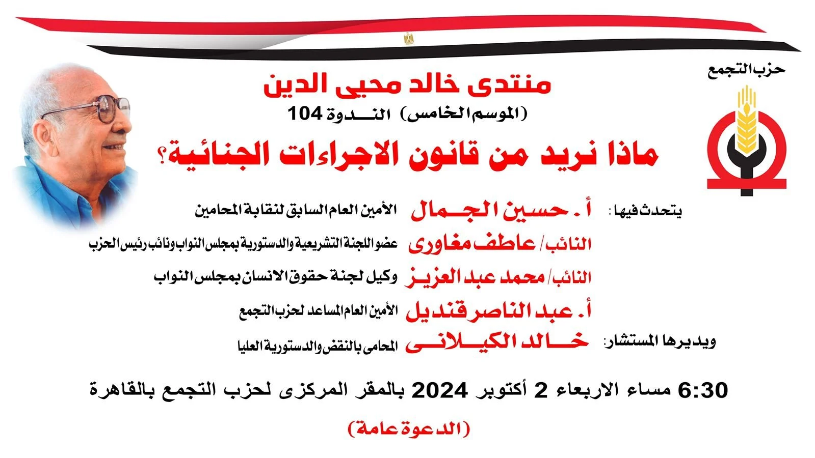 يعقد حزب التجمع برئاسة النائب سيد عبد العال رئيس الحزب وعضو مجلس الشيوخ منتدى خالد محيى الدين للموسم الخاص تحت عنوان ماذا نريد من قانون الإجراءات الجنائية حيث يتضمن المنتدى مجموعة من المحاور الاساسية التى اثارت الجدل داخل المجتمع، وذلك فى السادسة والنصف مساء الأربعاء الموافق 2 أكتوبر 2024 بالمقر المركزى لحزب التجمع بميدان طلعت حرب.