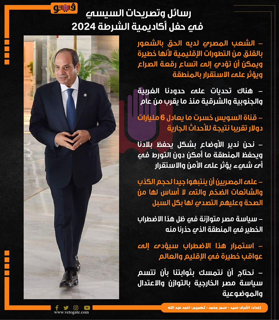 رسائل وتصريحات السيسي في حفل أكاديمية الشرطة 2024 (إنفوجراف) الأحد 29/سبتمبر/2024 - 02:06 م 9/29/2024 2:06:57 PM الرئيس عبد الفتاح السيسي.فيتو اشرف سيد - سمر محمد شارك طباعة 18 حجم الخط شارك طباعة مصر السيسي أخبار السيسي أبرز تصريحات الرئيس السيسي حفل أكاديمة الشرطة 2024