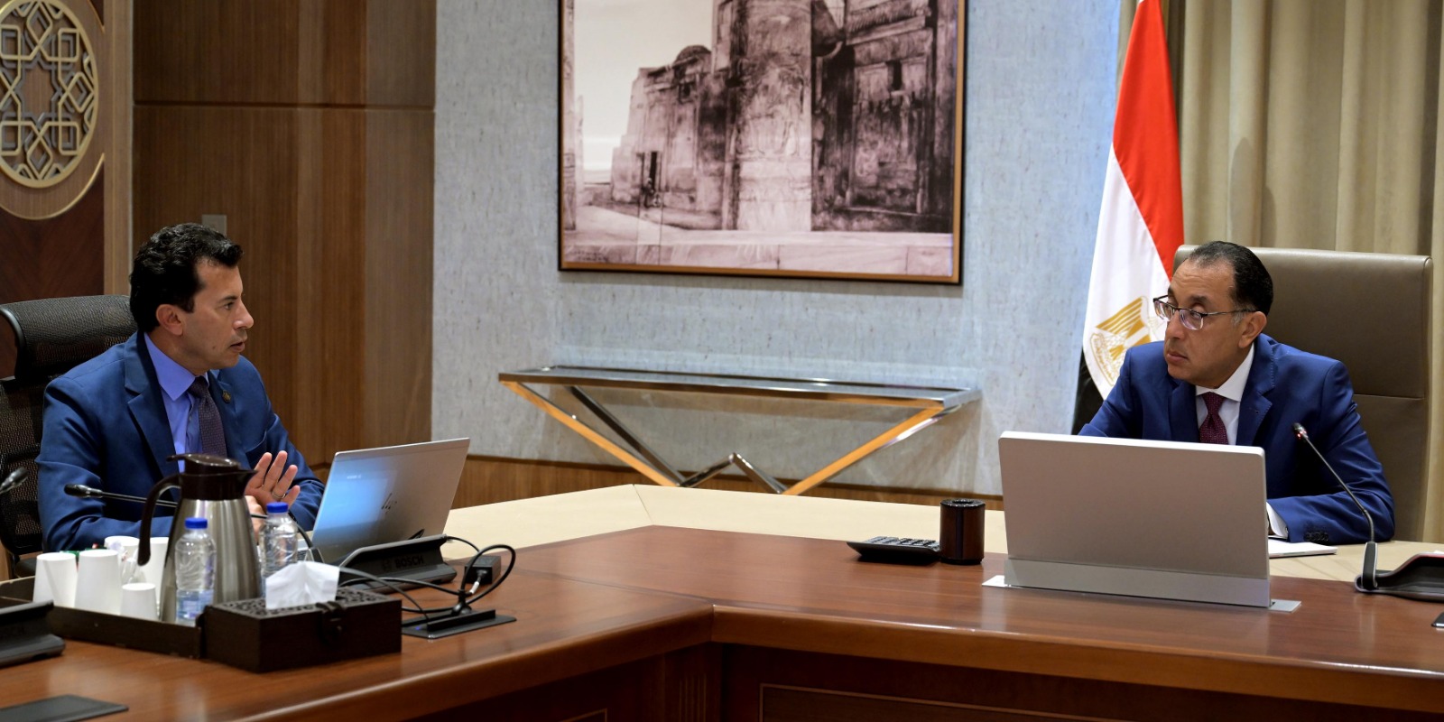 التقى اليوم الدكتور مصطفى مدبولي، رئيس مجلس الوزراء، الدكتور أشرف صبحي، وزير الشباب والرياضة، لمتابعة عددٍ من ملفات عمل الوزارة، بحضور مصطفى مجدي، مساعد وزير الشباب والرياضة للشئون الاستراتيجية والمعلومات.