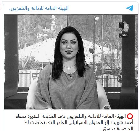 أعلنت الهيئة العامة للإذاعة والتلفزيون السوري فجر يوم الثلاثاء استشهاد المذيعة صفاء أحمد إثر العدوان الإسرائيلي الذي تعرضت له العاصمة دمشق.