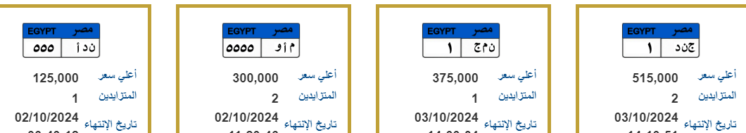 كما طرحت اللوحة المعدنية " م أ و5555" بسعر 300 ألف جنيه ويتنافس عليها شخصان، واللوحة المعدنية " ن د أ 555" بسعر 125 ألف جنيه.