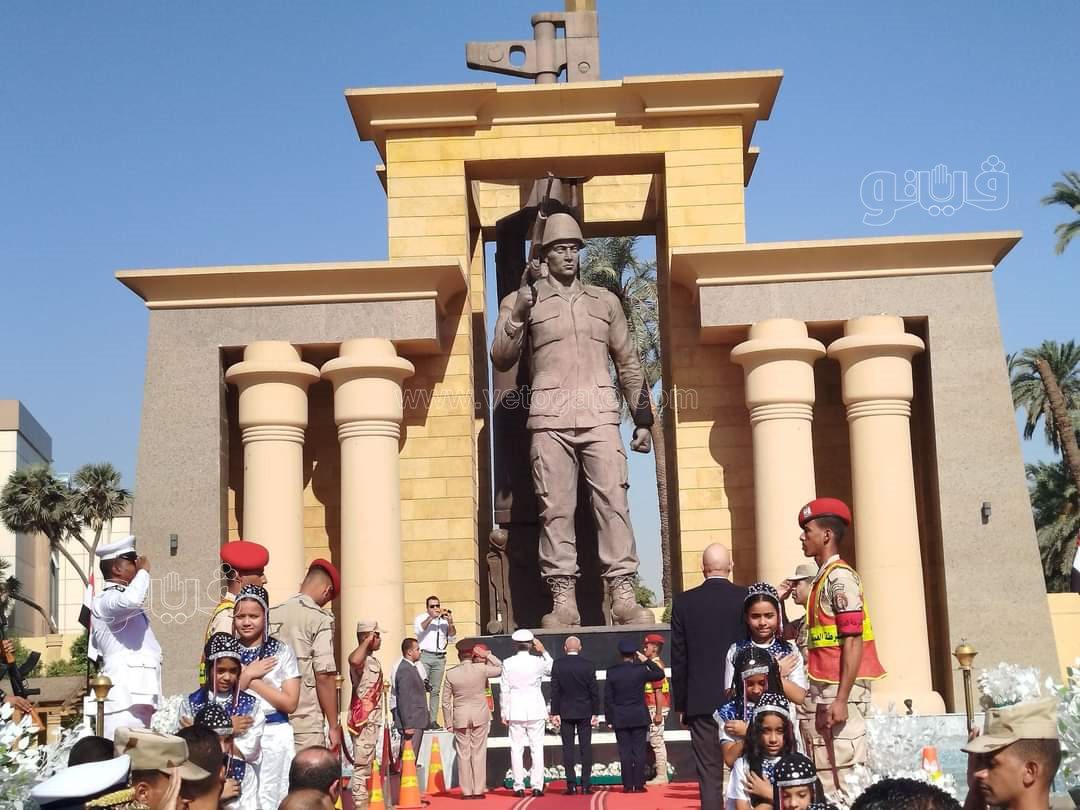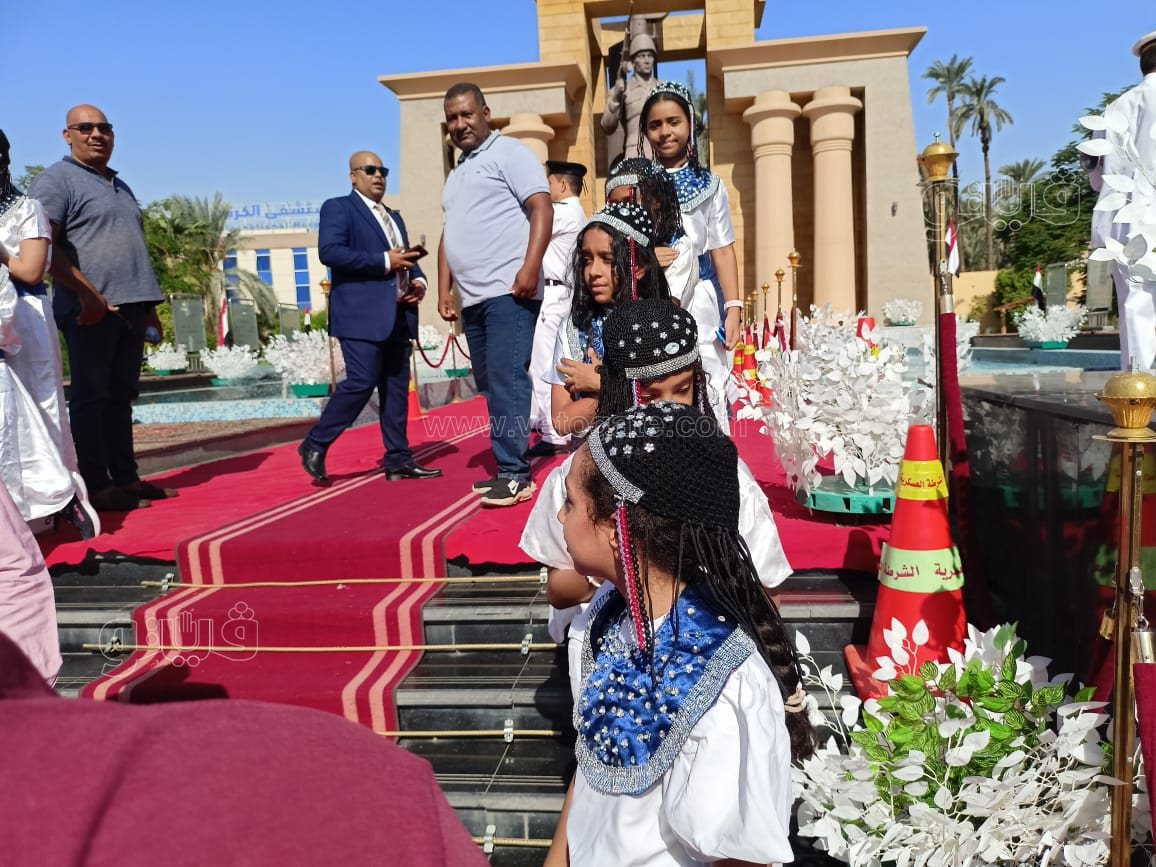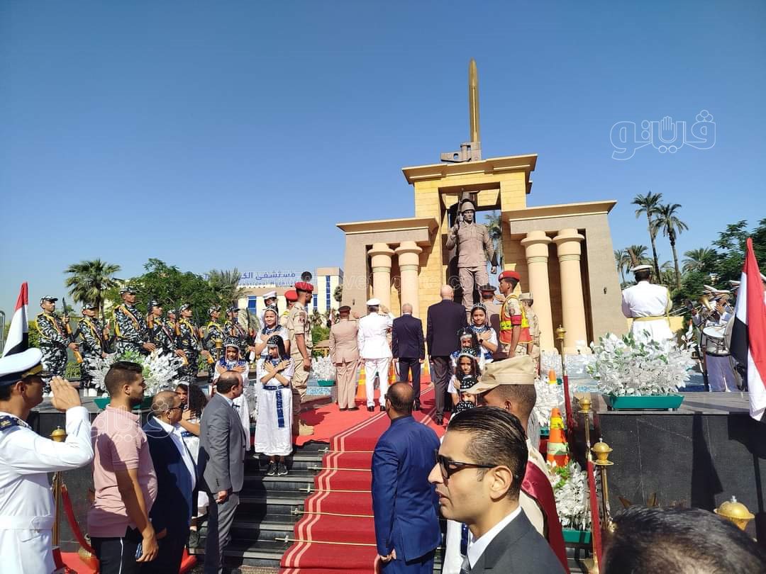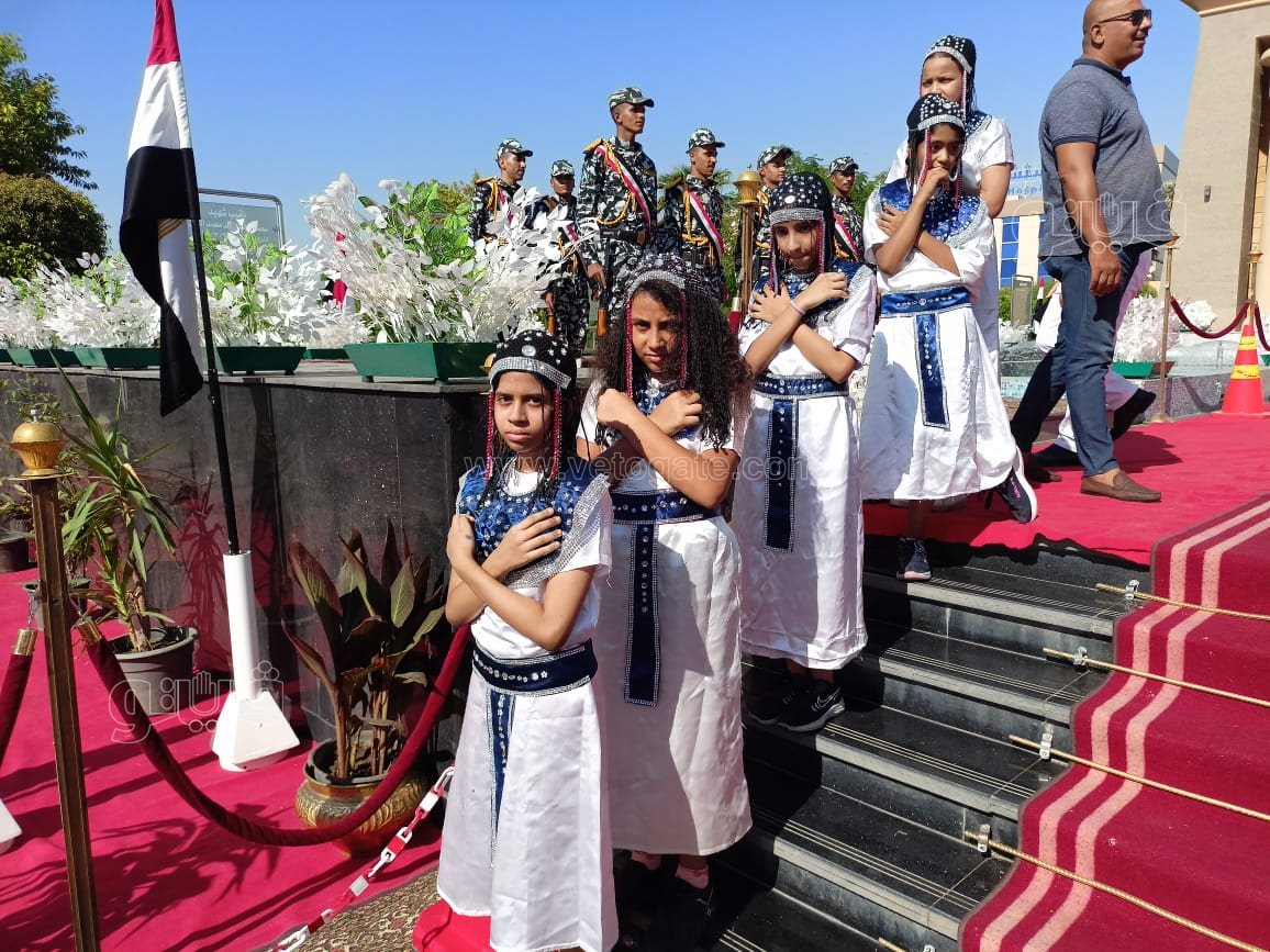 كم تم وضع إكليل من الزهور على النصب التذكاري للجندى المجهول، وظهر الاطفال بالزي الفرعوني على جانبي السلم للنصب، فيما تم توزيع بعض الحلوى والشيكولاتة على الحاضرين لمراسم الاحتفال.