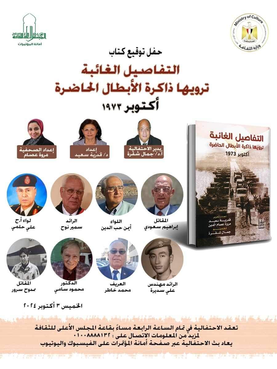 ينظم المجلس الأعلى للثقافة وزارة الثقافة، بأمانة الدكتور أسامة طلعت ندوة وحفل توقيع كتاب: "التفاصيل الغائبة ترويها ذاكرة الأبطال الحاضرة أكتوبر ١٩٧٣".