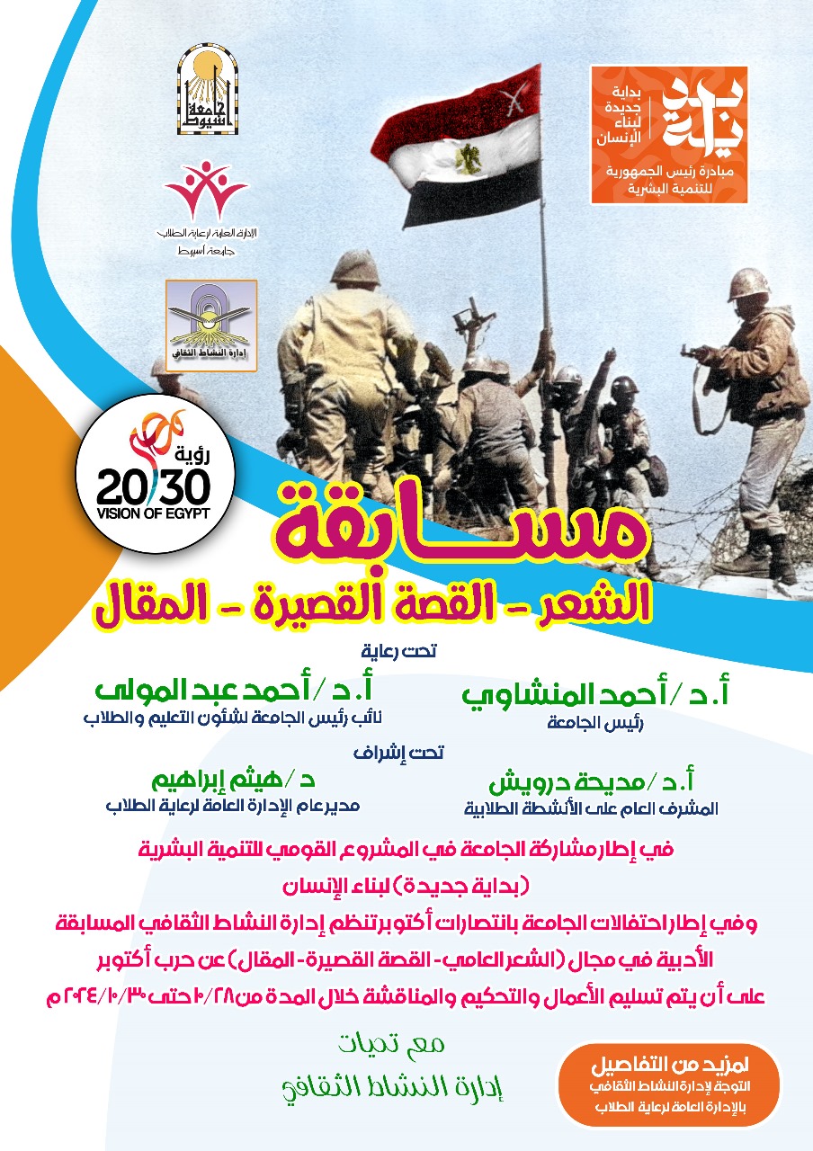 تنظم جامعة أسيوط، تحت رعاية الدكتور أحمد المنشاوي، رئيس الجامعة؛ مسابقة أدبية بمناسبة احتفال الجامعة بالذكرى الـ51 لانتصارات أكتوبر المجيدة، تحت إشراف الدكتور أحمد عبدالمولي نائب رئيس الجامعة لشئون التعليم والطلاب، وذلك في إطار حرص الجامعة على تنمية الحس الوطني لدى طلابها، وتعريفهم بقيمة هذا النصر الذي أعاد لمصر كامل ترابها الوطني.