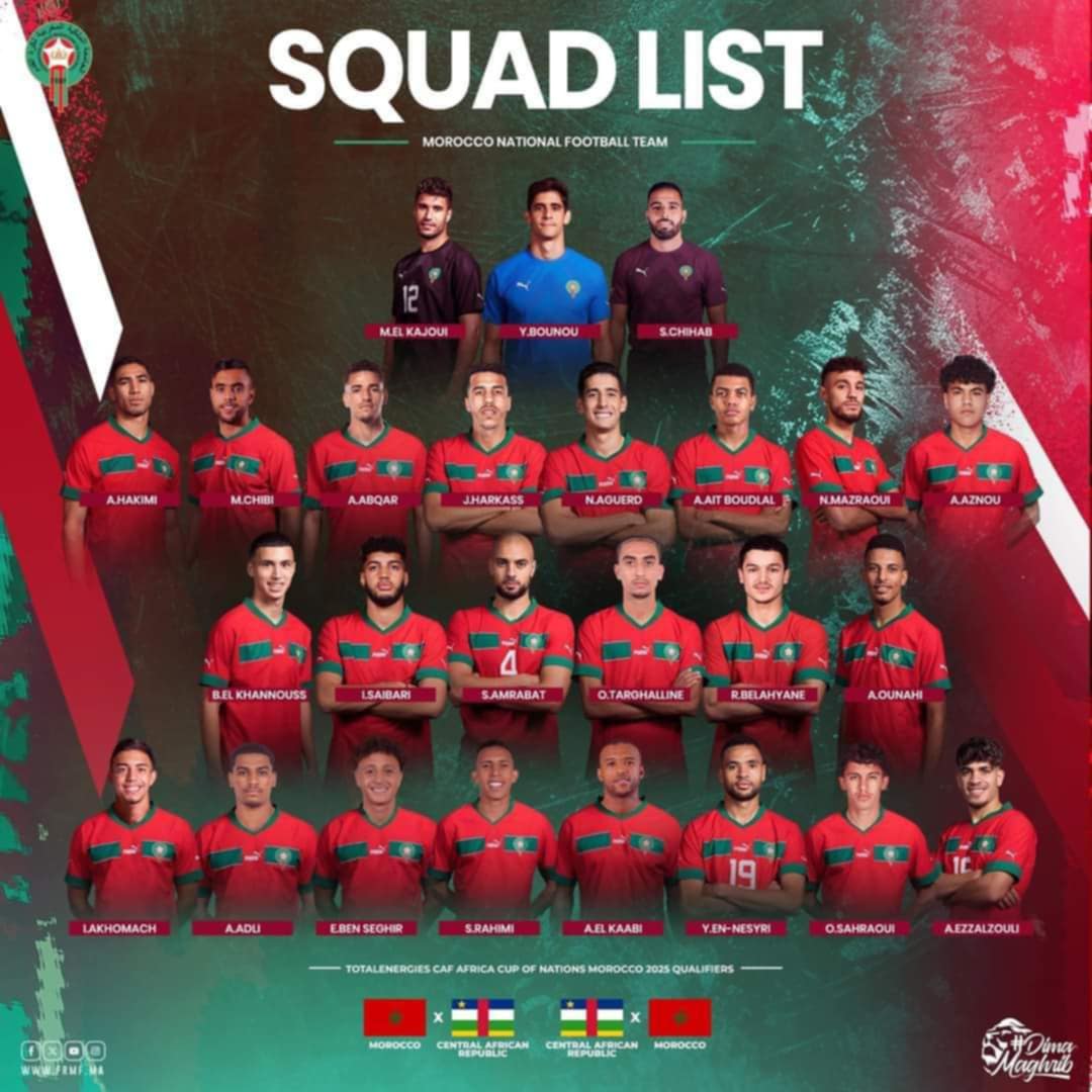 كما أعلن وليد الركراكي المدير الفني للمنتخب المغربي، عن قائمة اللاعبين لمباراتي أفريقيا الوسطى في تصفيات كأس الأمم الأفريقية 2025 التي تقام في المغرب.