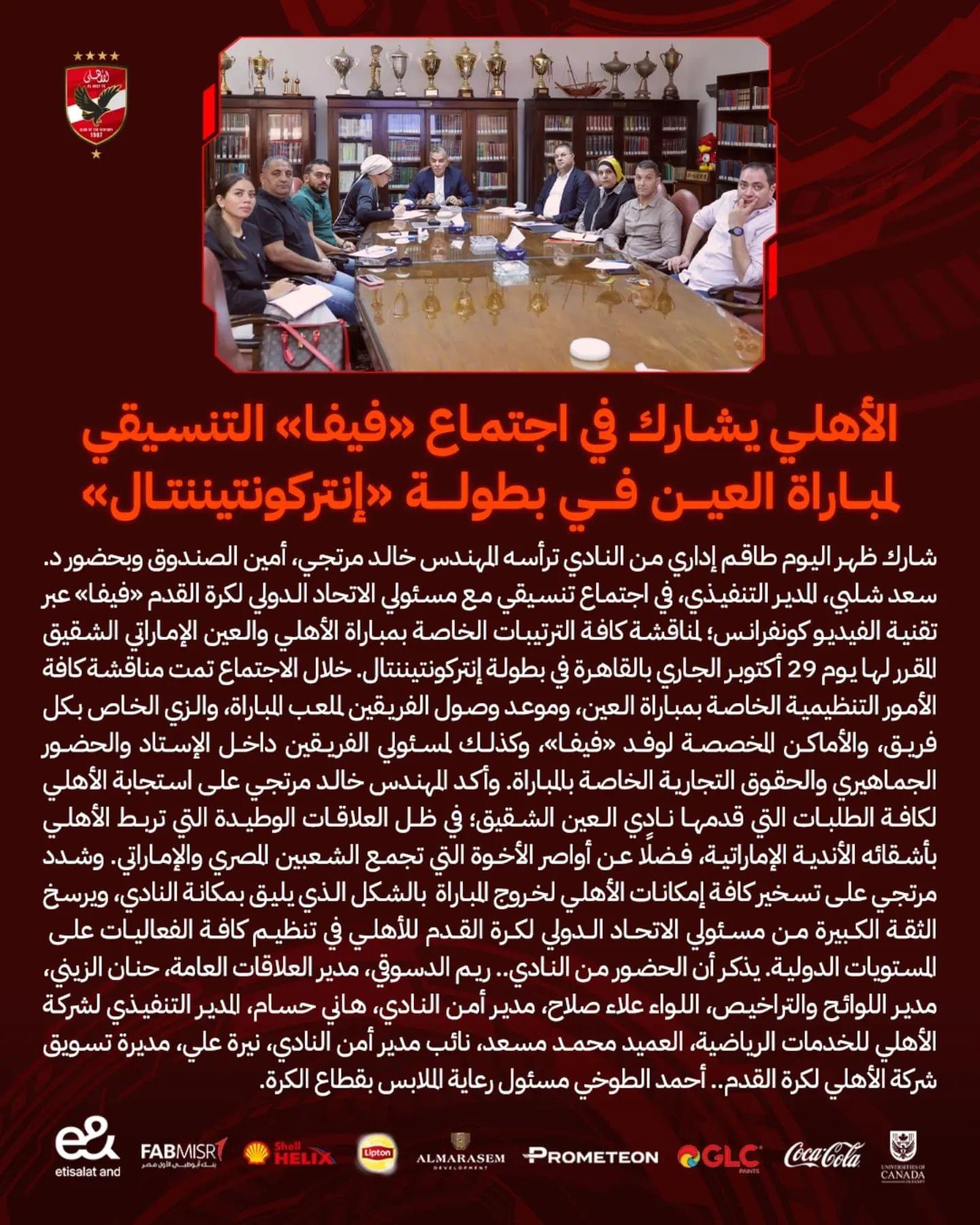 وخلال الاجتماع، تمت مناقشة كافة الأمور التنظيمية الخاصة بمباراة العين، وموعد وصول الفريقين لملعب المباراة، والزي الخاص بكل فريق، والأماكن المخصصة لوفد «فيفا»، وكذلك لمسئولي الفريقين داخل الإستاد والحضور الجماهيري والحقوق التجارية الخاصة بالمباراة.
