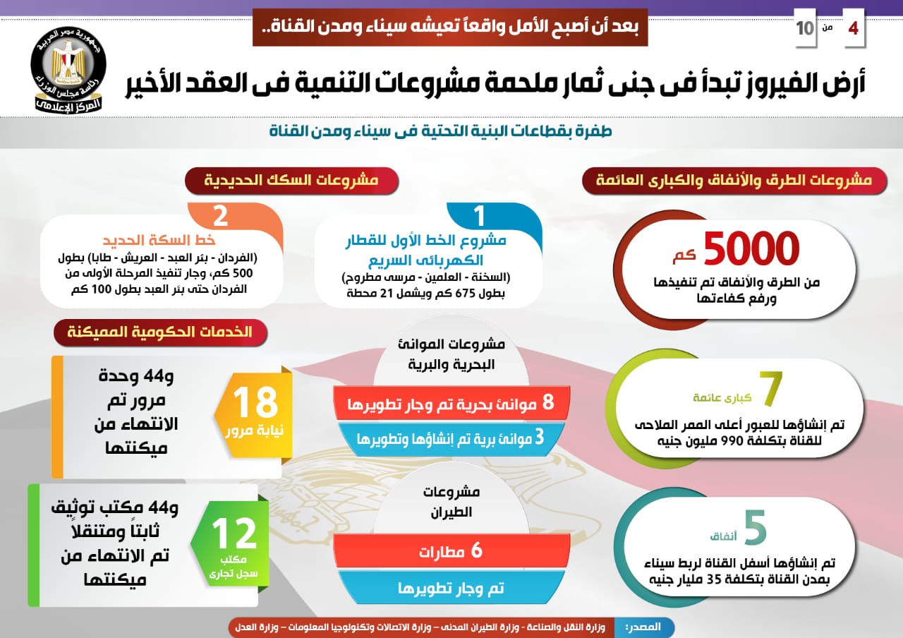 نشر المركز الإعلامي لمجلس الوزراء تقريرًا تضمن إنفوجراف بعنوان "أرض الفيروز تبدأ في جني ثمار ملحمة مشروعات التنمية في العقد الأخير"، وذلك بعد أن أصبح الأمل واقعًا تعيشه سيناء ومدن القناة، خاصة في ظل تكامل عناصر البناء والتنمية ودعائم الأمن والاستقرار على أرض سيناء، لتصبح منطقة واعدة في جذب الاستثمارات، في ظل ما تمتلكه أرض الفيروز ومدن القناة من موقع فريد وحيوي، ومقومات وإمكانيات استراتيجية تؤهلها لإنجاح السياسات التنموية ورؤى النهضة الشاملة للدولة المصرية.