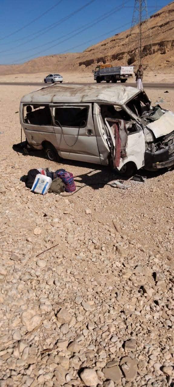 وشهد طريق "قنا - سوهاج " الصحراوى، حادث مروع، اليوم السبت، أسفر عن مصرع 8 أشخاص وإصابة 10 آخرين أثر انقلاب سيارة ميكروباص بالضحايا نحو 3 مرات ثم استقر على جانب من الطريق.