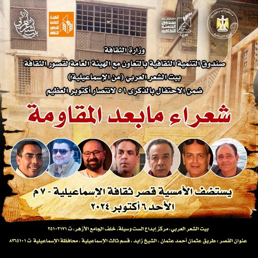 فيستضيف قصر ثقافة الإسماعيلية أمسية شعرية جديدة في السابعة من مساء اليوم الأحد الموافق السادس من أكتوبر الجاري، أمسية شعرية بعنوان: "شعراء ما بعد المقاومة" والتي ينظمها بيت الشعر العربي، التابع لقطاع صندوق التنمية الثقافية.