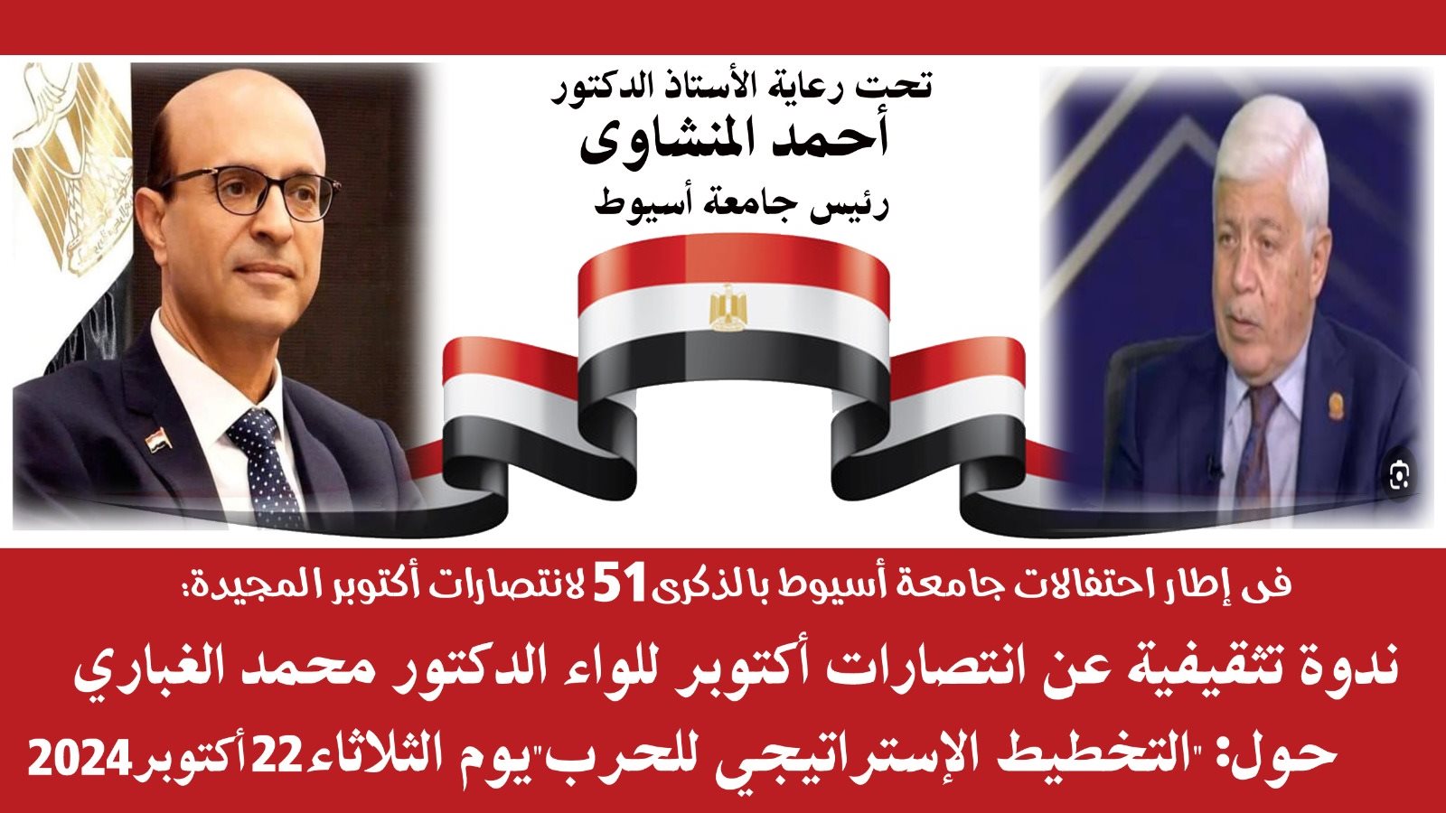تنظم جامعة أسيوط، تحت رعاية الدكتور أحمد المنشاوي رئيس الجامعة؛ في إطار احتفالاتها؛ بذكرى انتصارات أكتوبر المجيدة؛ ندوة تثقيفية، لغرس روح الولاء، والانتماء، ونشر الوعي بين طلبة الجامعة، بعنوان: "التخطيط الإستراتيجي للحرب، والدفاع الإستراتيجي"، وذلك يوم الثلاثاء الموافق ٢٢ من أكتوبر؛ ضمن احتفال الجامعة؛ بإحياء الذكرى (٥١) لانتصارات أكتوبر المجيدة، وذلك بقاعة المؤتمرات الكبرى بالجامعة.