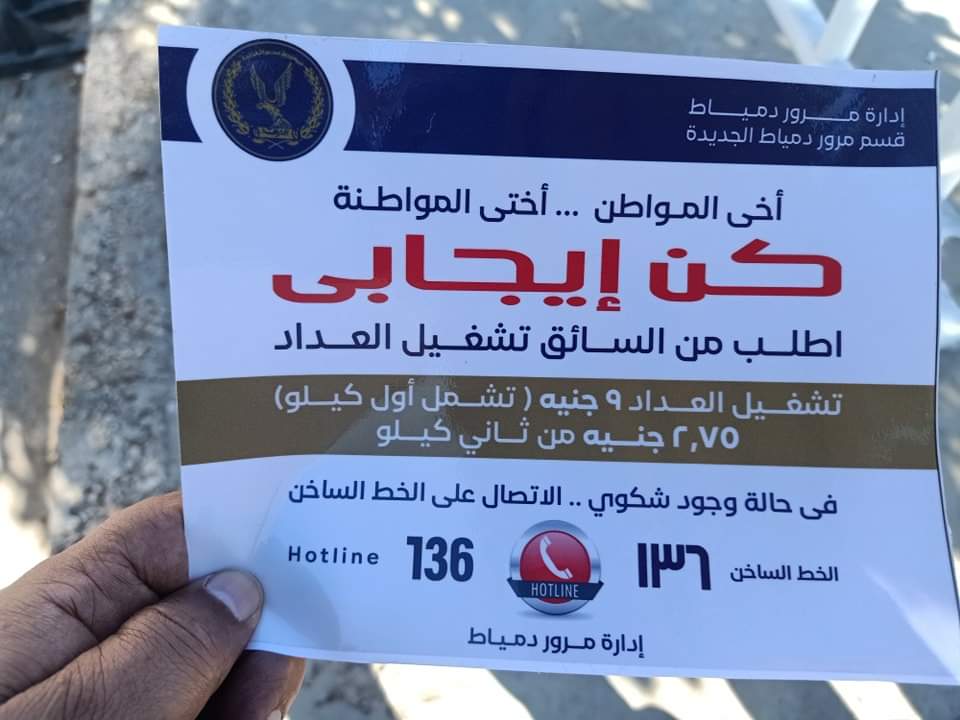 قام اليوم الرائد أحمد بليغ العناني رئيس وحدة مرور دمياط الجديدة، بتفعيل مبادرة توعوية جديدة بعنوان "كن إيجابى" للقضاء على ظاهرة استغلال ومغالاة بعض سائقي التاكسي بالمدينة في الأجرة، وذلك فى إطار التنسيق الكامل بين مديرية أمن دمياط، وجهاز تنمية مدينة دمياط الجديدة، ومجلس الأمناء، وتوجيهات اللواء عصام هلال، مساعد وزير الداخلية مدير أمن دمياط، والدكتور مهندس محمد خلف الله رئيس جهاز تنمية مدينة دمياط الجديدة،والدكتور أسامة حفيلة رئيس مجلس الأمناء، والعميد محمد التل مدير إدارة مرور دمياط، للقضاء على الظواهر السلبية بالمدينة.